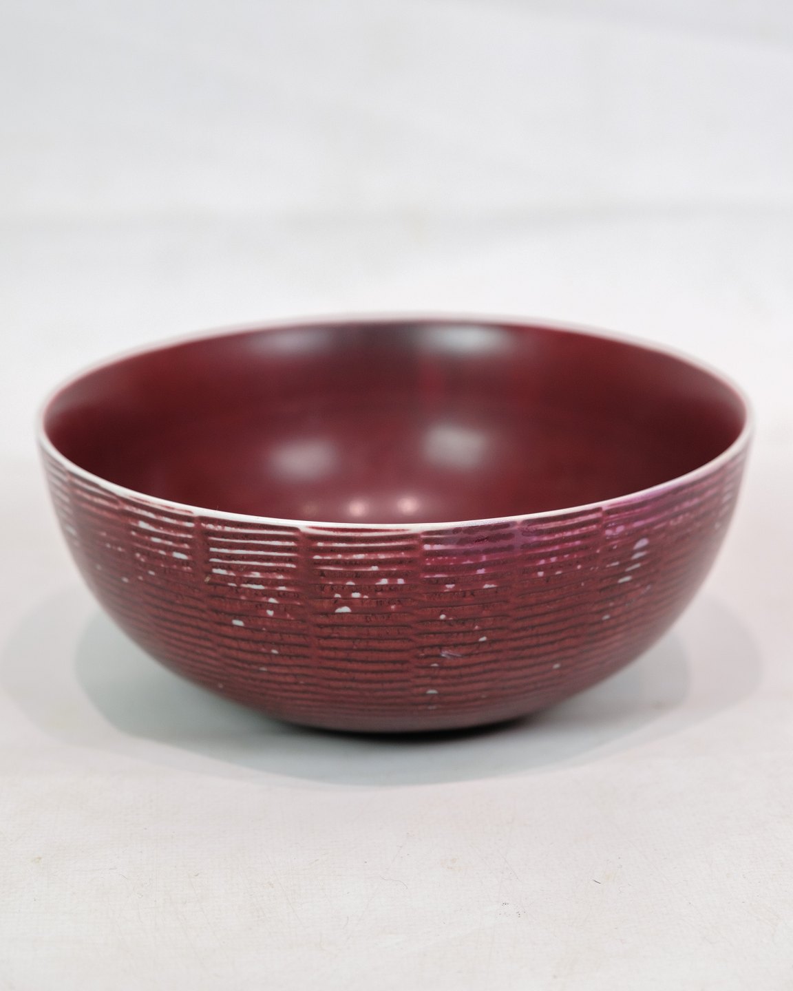 Kontakt os vedrørende prisKeramikskål, model 20.717, med okseblodsfarvet glasur, designet af Axel Salto for Royal Copenhagen. Skålen er et klassisk eksempel på Salto's eksperimenterende tilgang til keramik, hvor han brugte mange forskellige glasurer for at skabe dybe og rige farvetoner.
