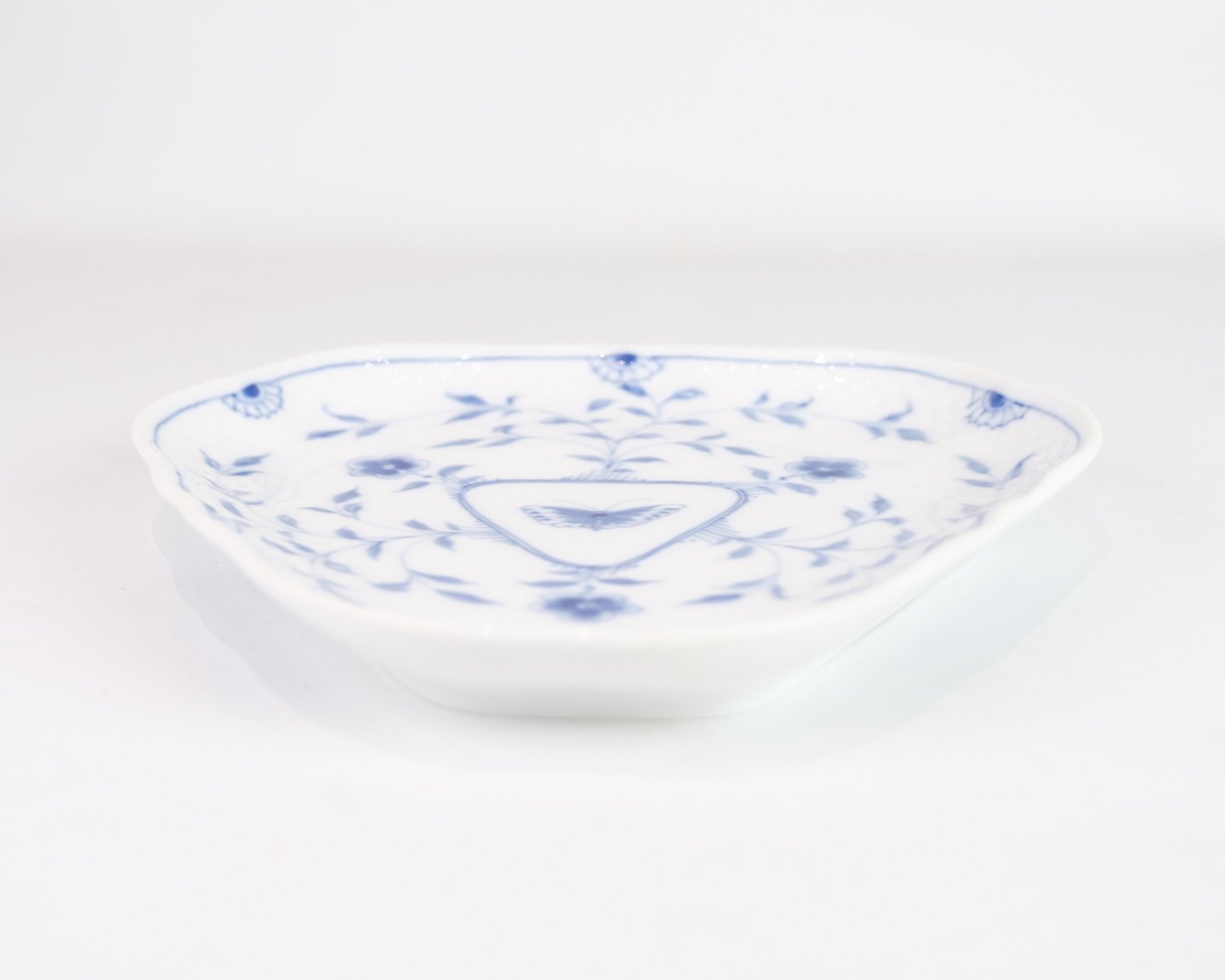Triangular dish no. 4 from Bing & Grondahl. Made of porcelain with hand-painted butterfly motif. Unique shape, suitable for serving or as a decorative element. Stamped under the bottom.