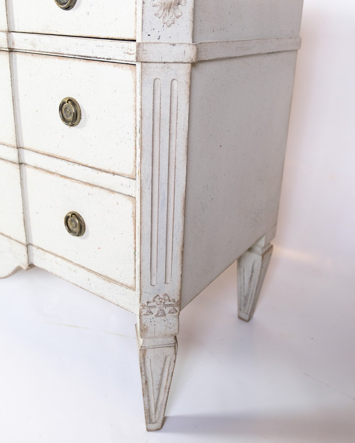 Gustavian chest of drawers from the 1840s with three drawers, painted grey in a classic style. Top made of marbled wood, giving an elegant expression. Swedish origin with period carvings and details. An authentic piece of furniture with both function and decorative value.