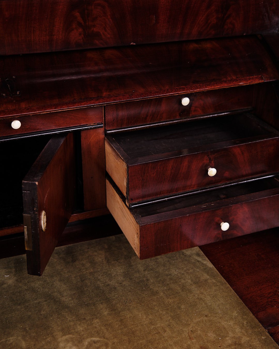 — Material: Hand-polished mahogany with mother-of-pearl fittings and leg knobs