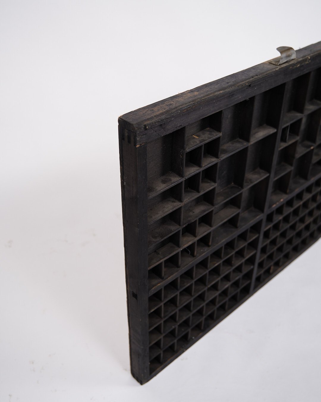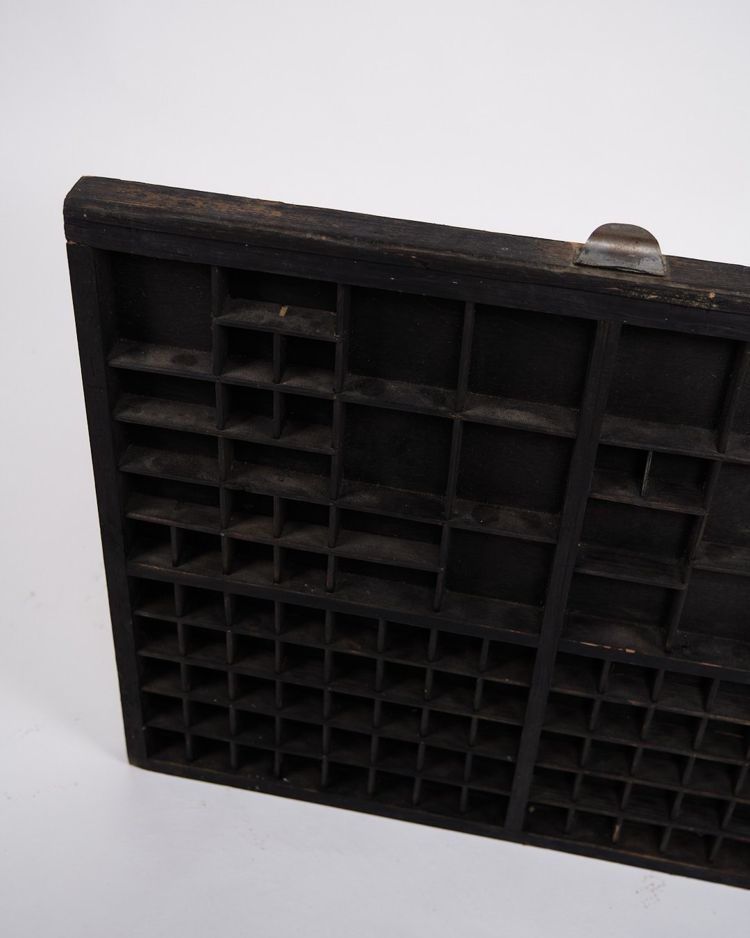 Old wall-mounted planter box from the 1930s. Black painted wood with small compartments.