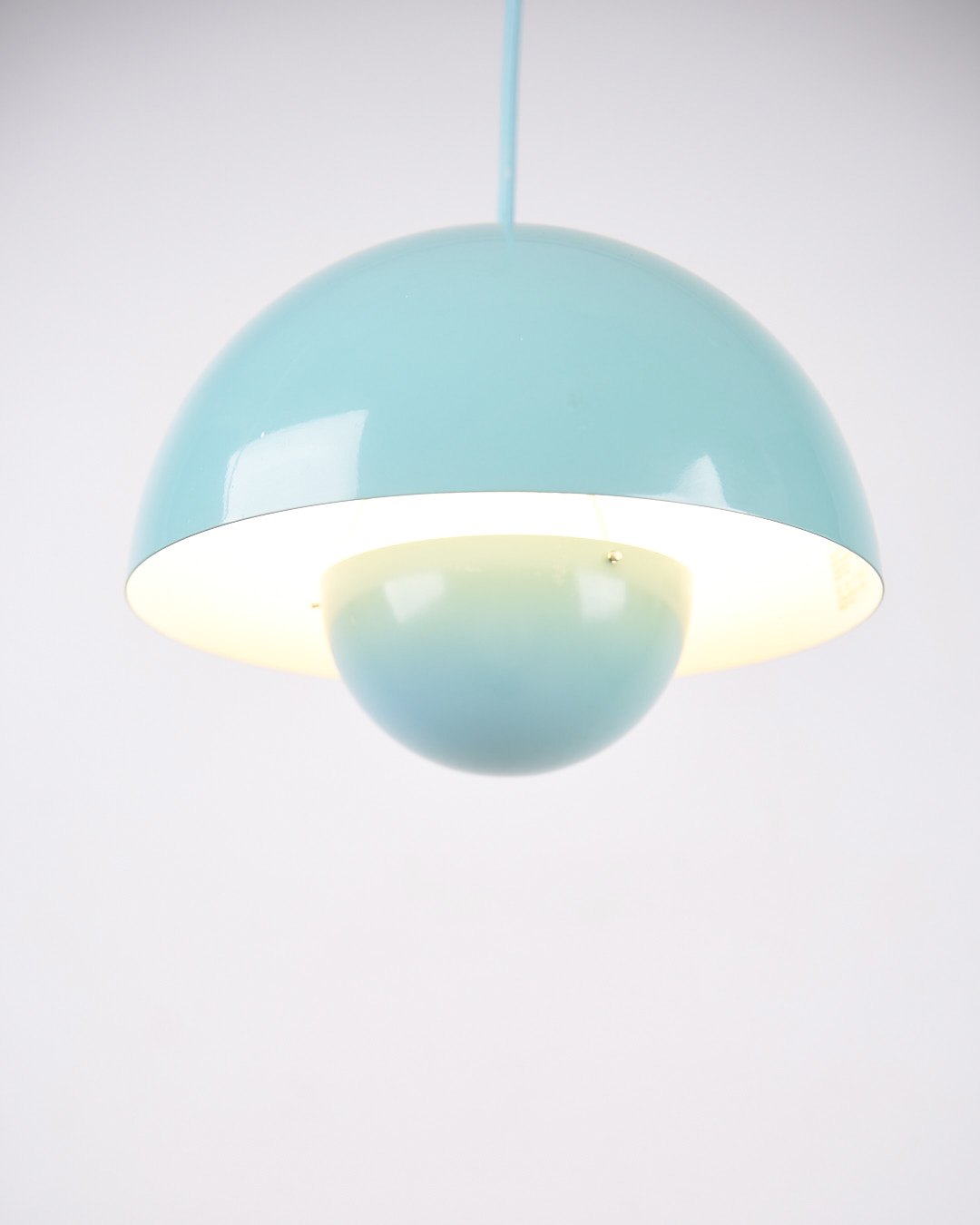 Flowerpot pendant lamp, model VP1, designed by Verner Panton in 1968 and produced by &Tradition. The lamp is made of baby blue lacquered metal with the iconic double shade design.