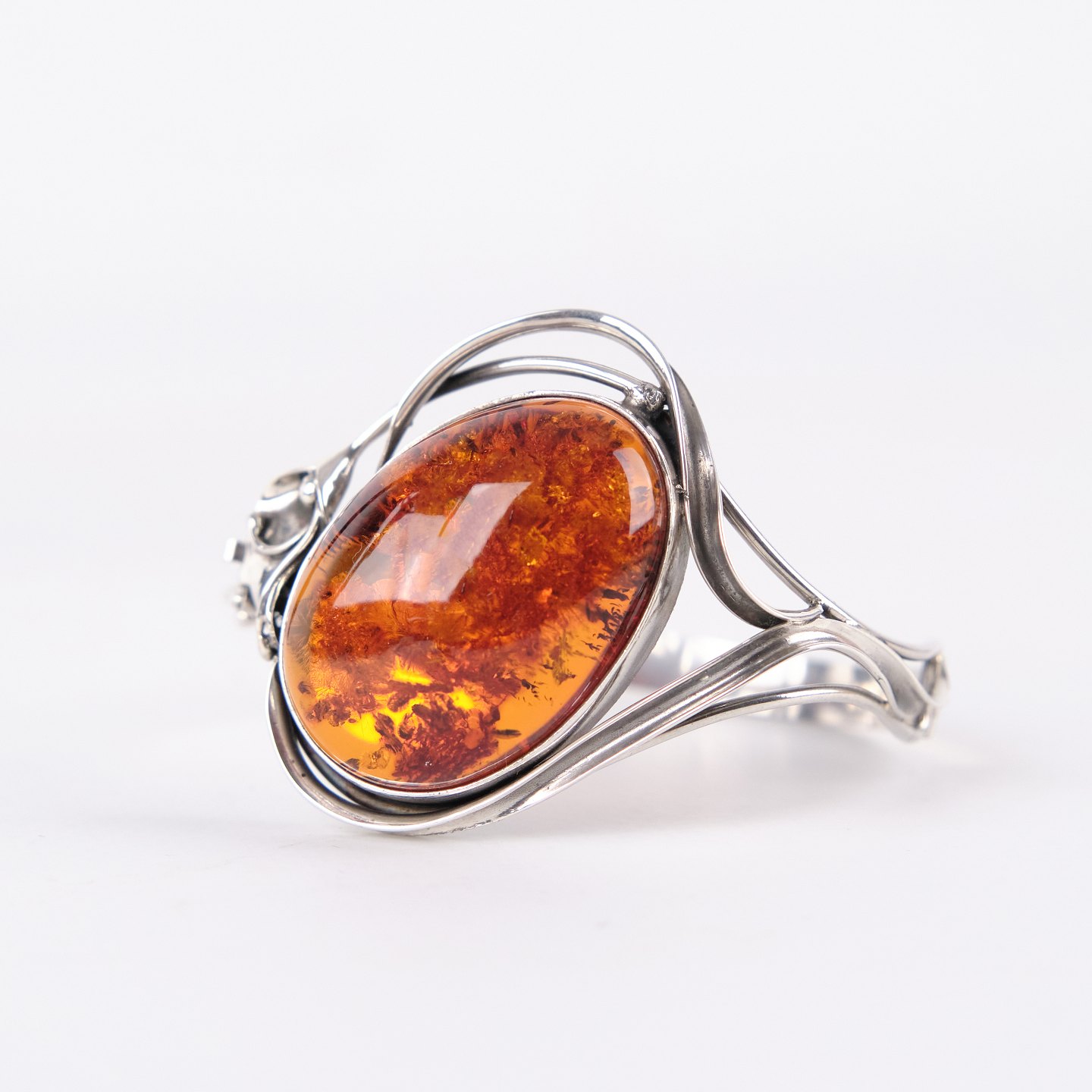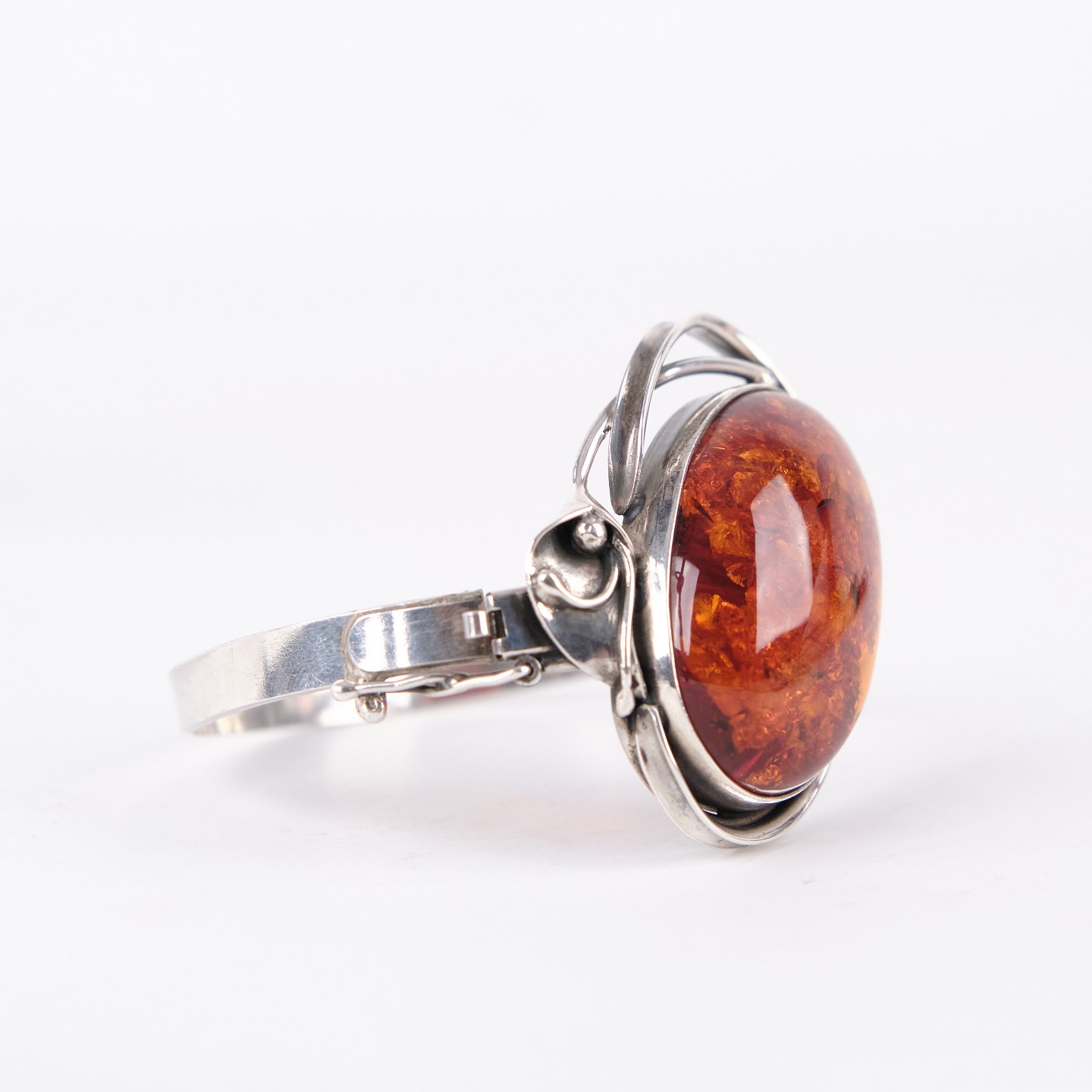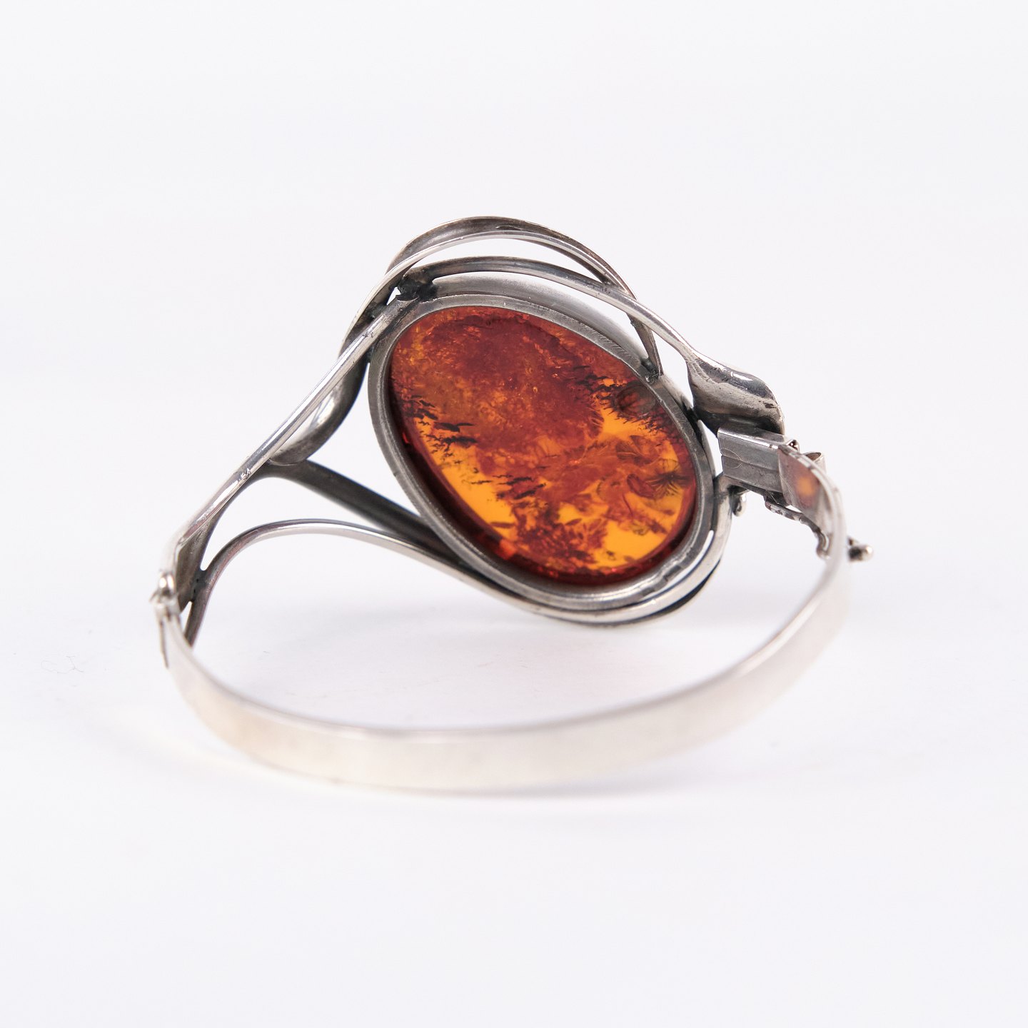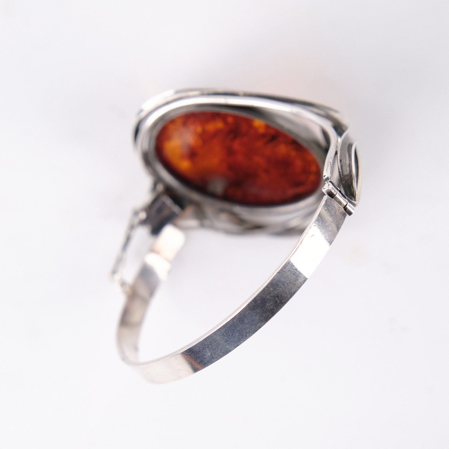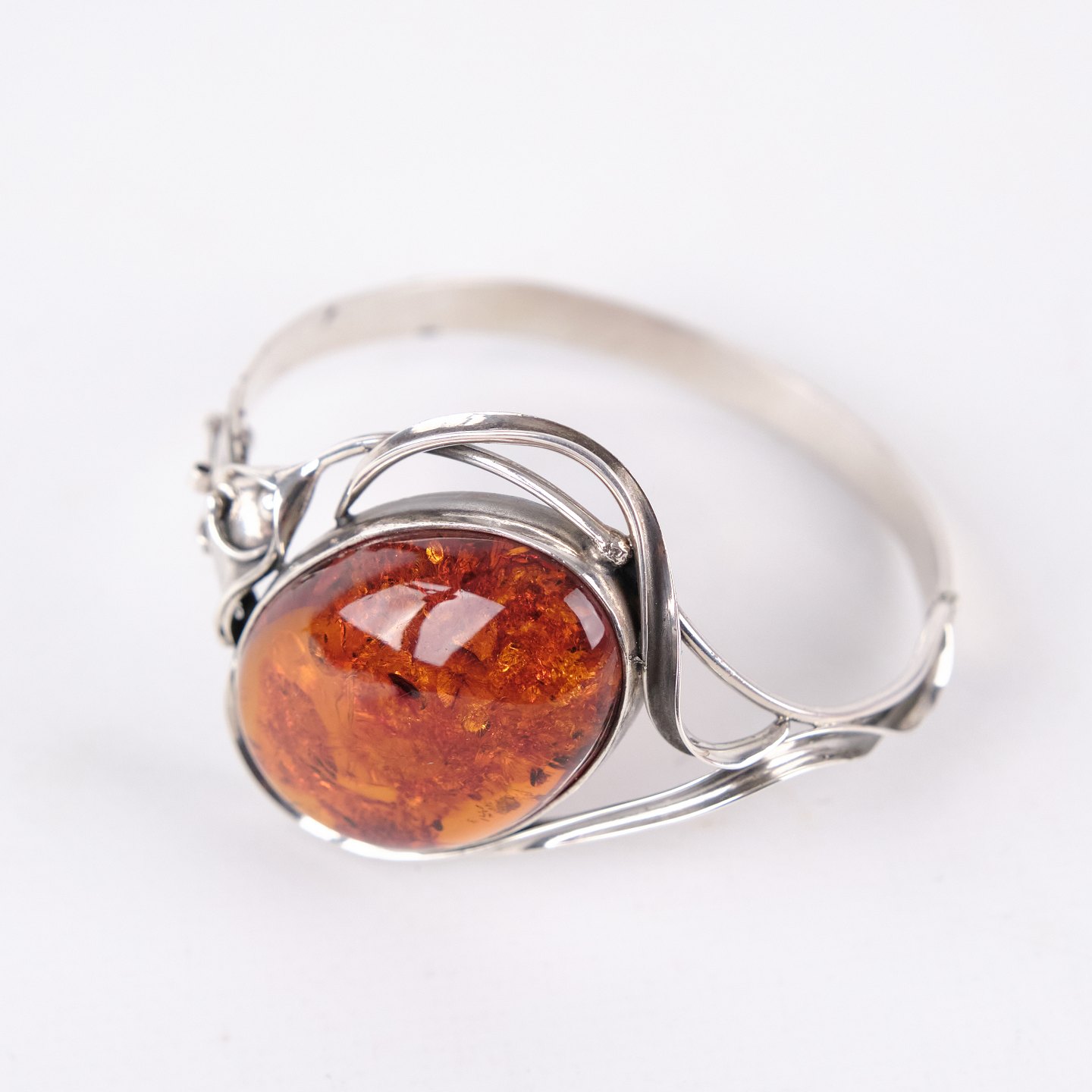 Silver bangle with amber and safety clasp. Unique jewelry design with amber.