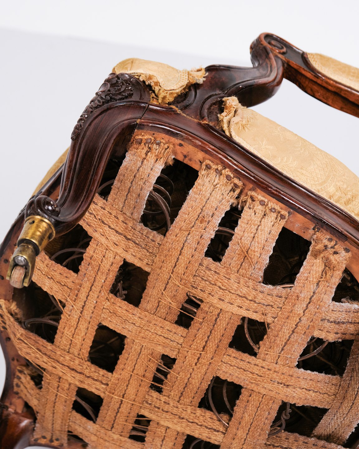Antique armchair made of mahogany with carved details in the Rococo style, dated to around the 1890s. The seat and back are upholstered with floral upholstery.