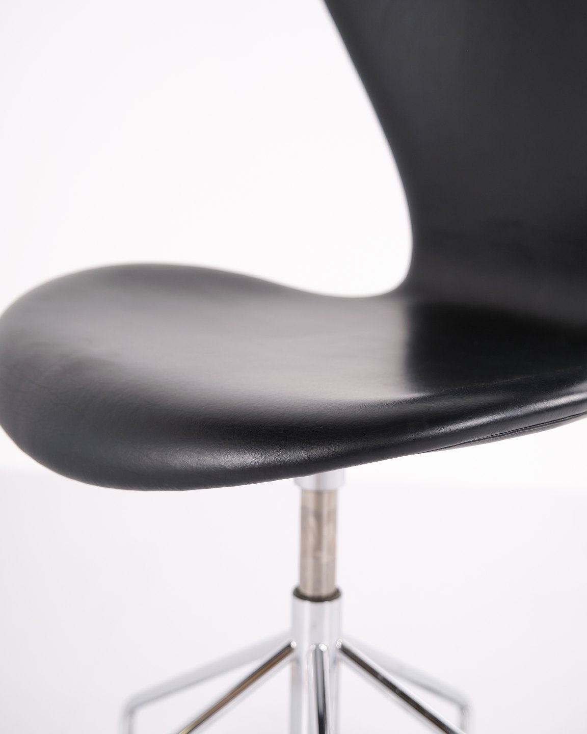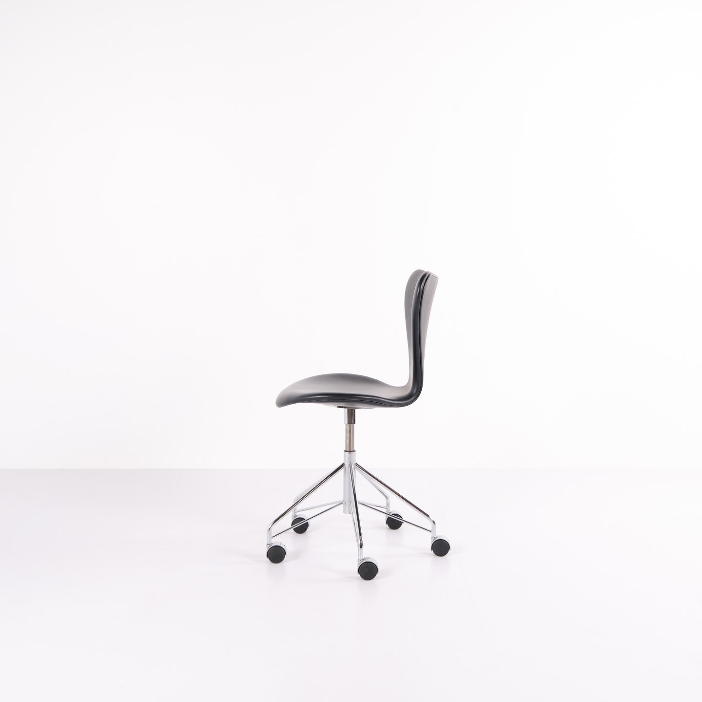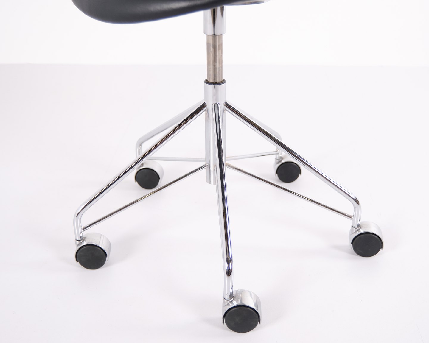Arne Jacobsen Syver office chair, model 3117, for Fritz Hansen. In black leather and chrome frame with wheels. Classic Danish design.