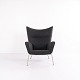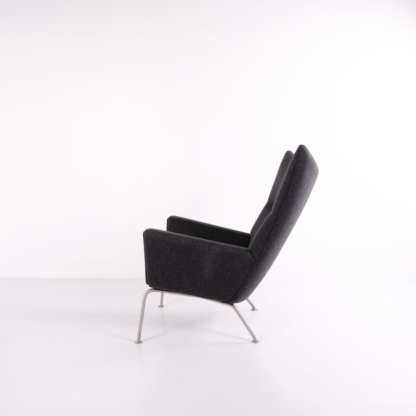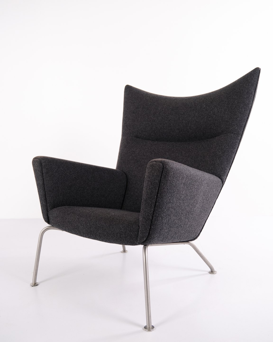 CH445 Wingchair designed by Hans J. Wegner and produced by Carl Hansen & Søn. Upholstered in grey Hallingdal fabric with matching footstool. A classic high-back Wegner model with distinctive wings and excellent seating comfort. A well-known Danish design icon.