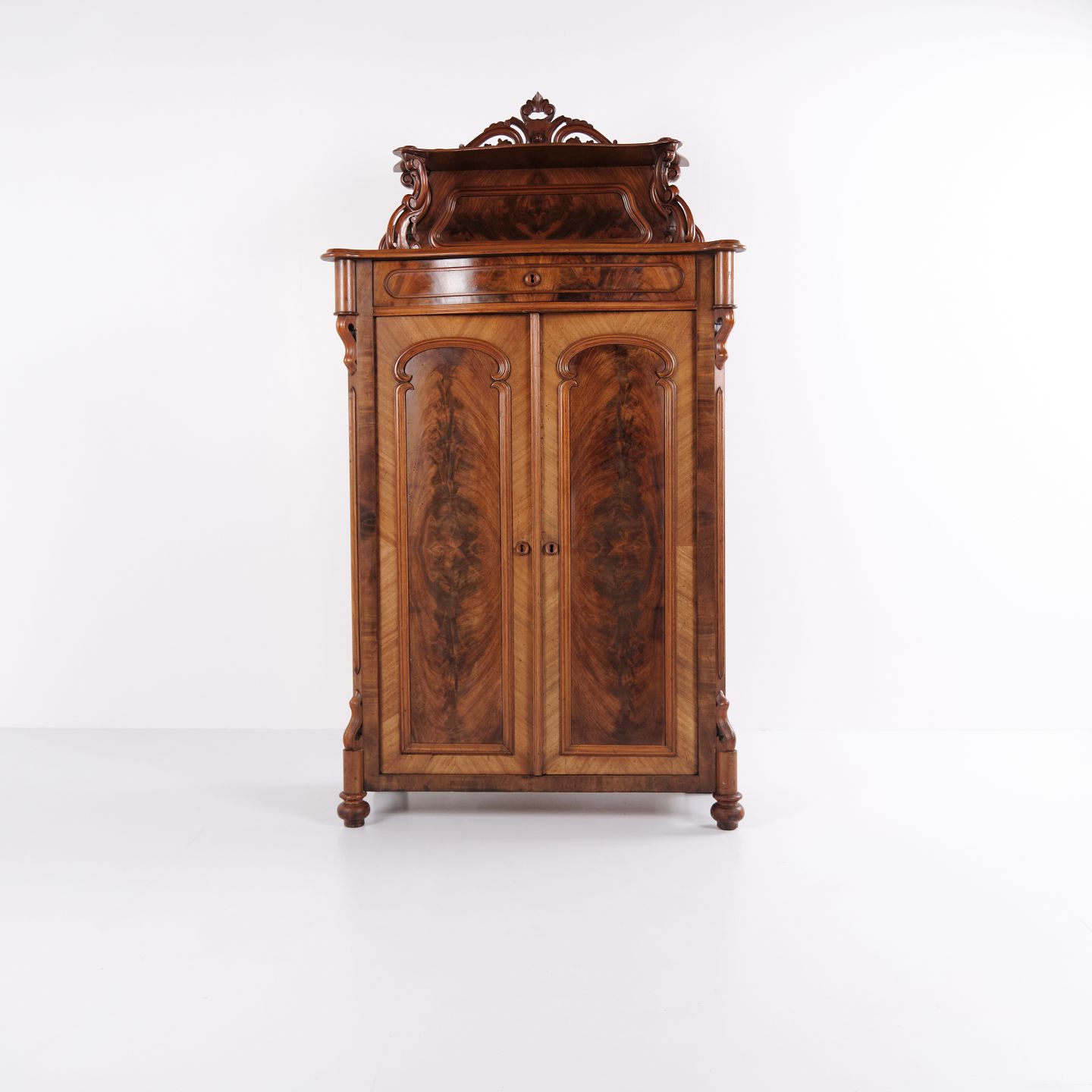 Antique mahogany cabinet from the 1880s with decorative carvings. Features doors and interior shelves, suitable for storage in living rooms, hallways or dining areas.