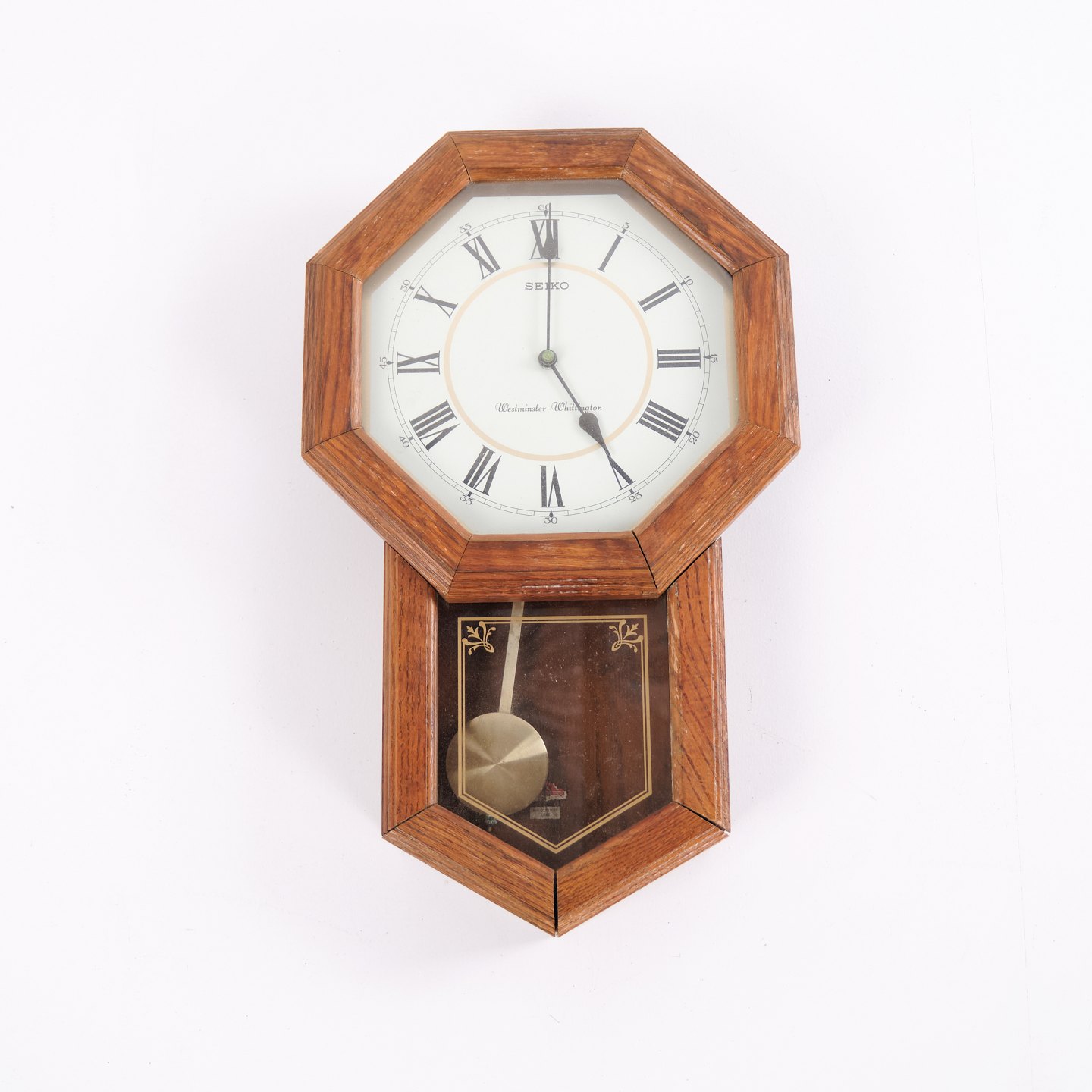 Wall clock by Seiko featuring Westminster and Whittington chime melodies. Crafted in oak with a classic front and clear dial. A quality clock with precise movement and a timeless appearance.