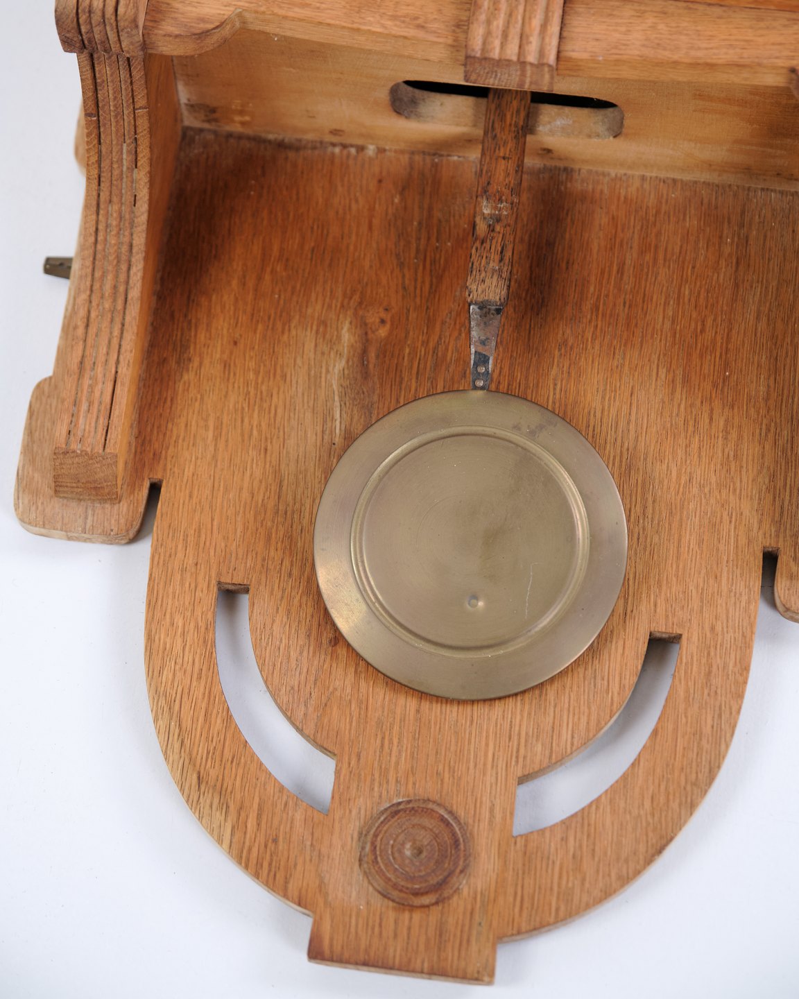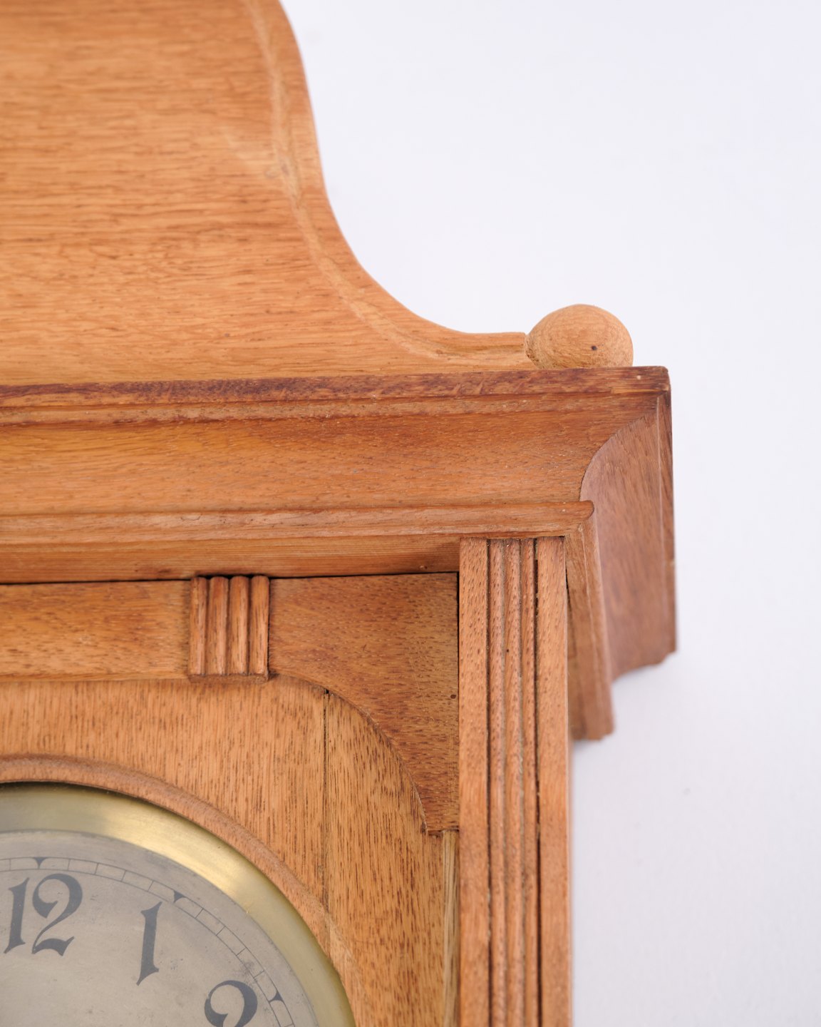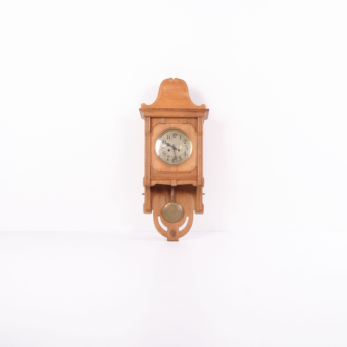 Wall clock from the early 1930s, crafted in oak and designed in the characteristic organic style of Art Nouveau. The case features elegant detailing and a classic front that reflects the craftsmanship of the period.