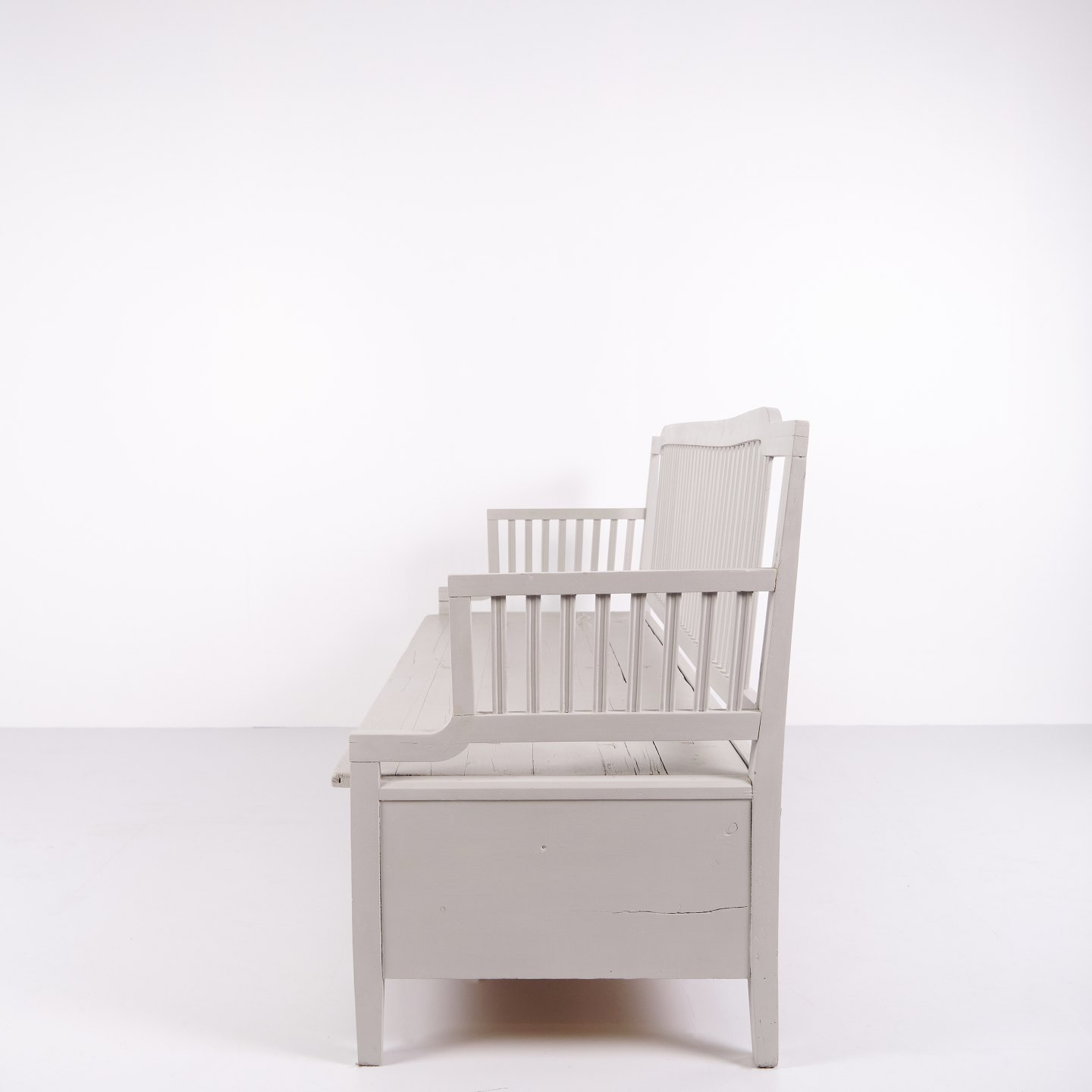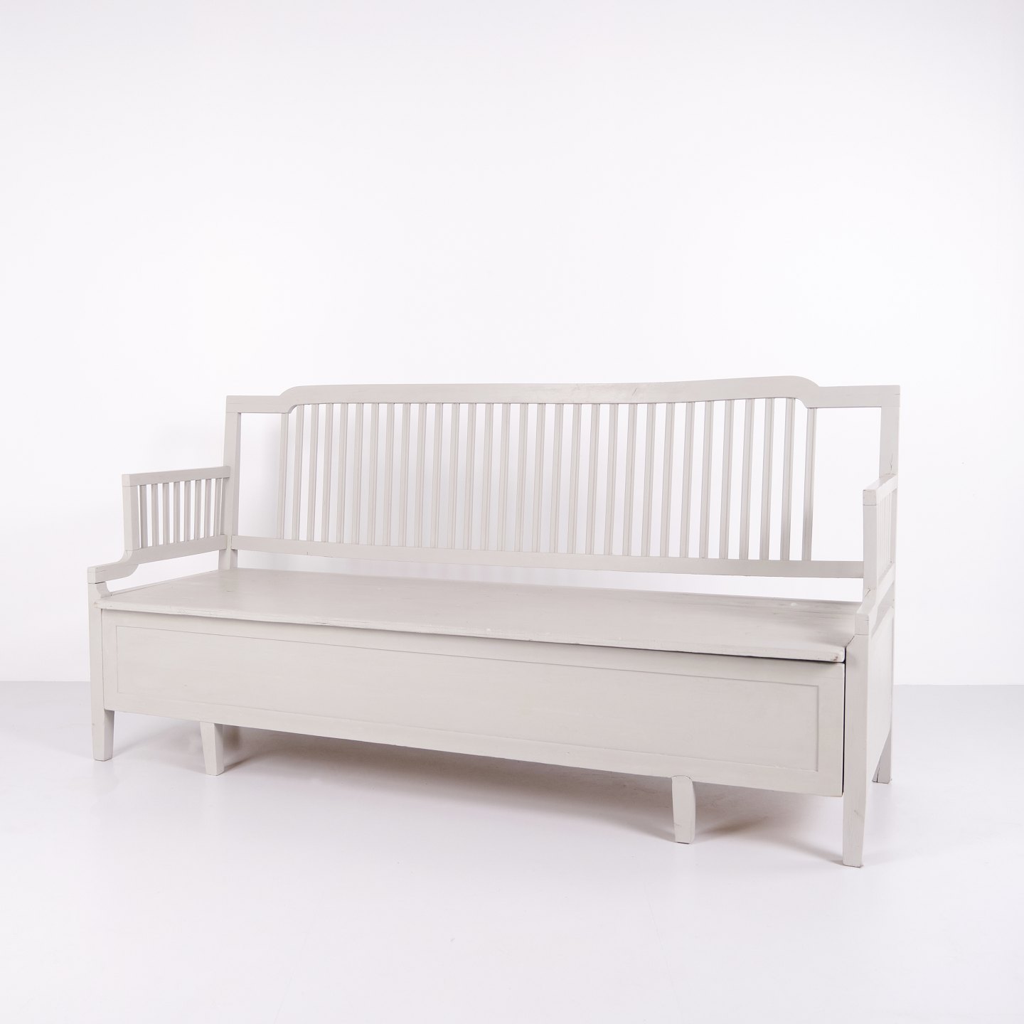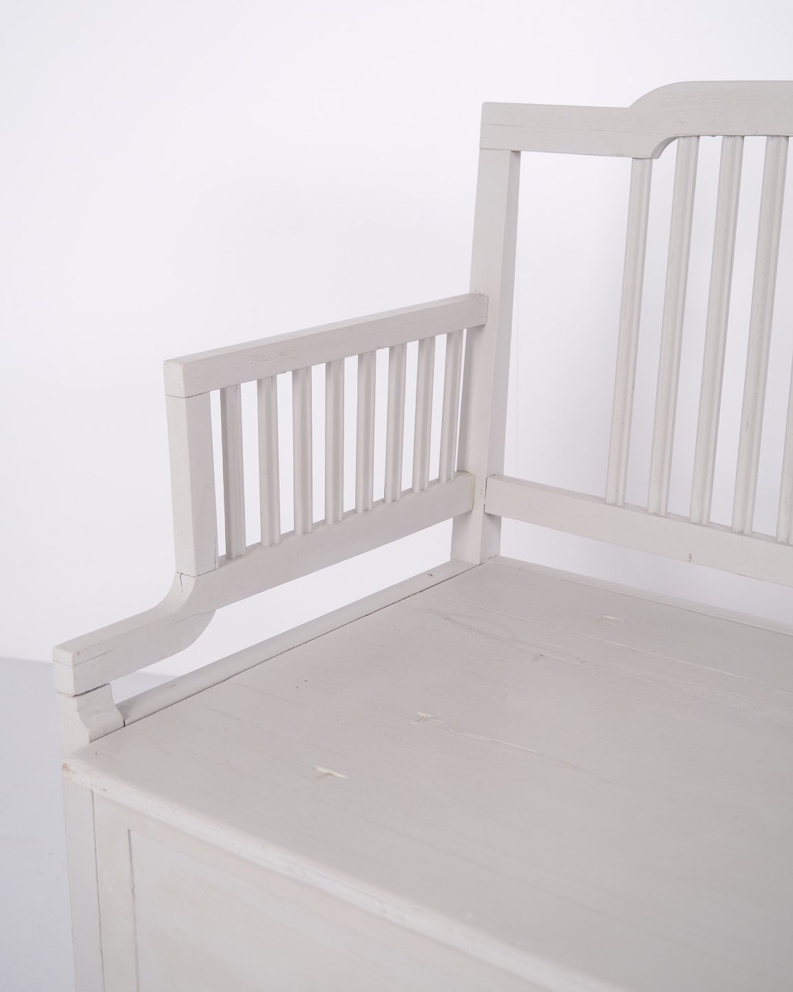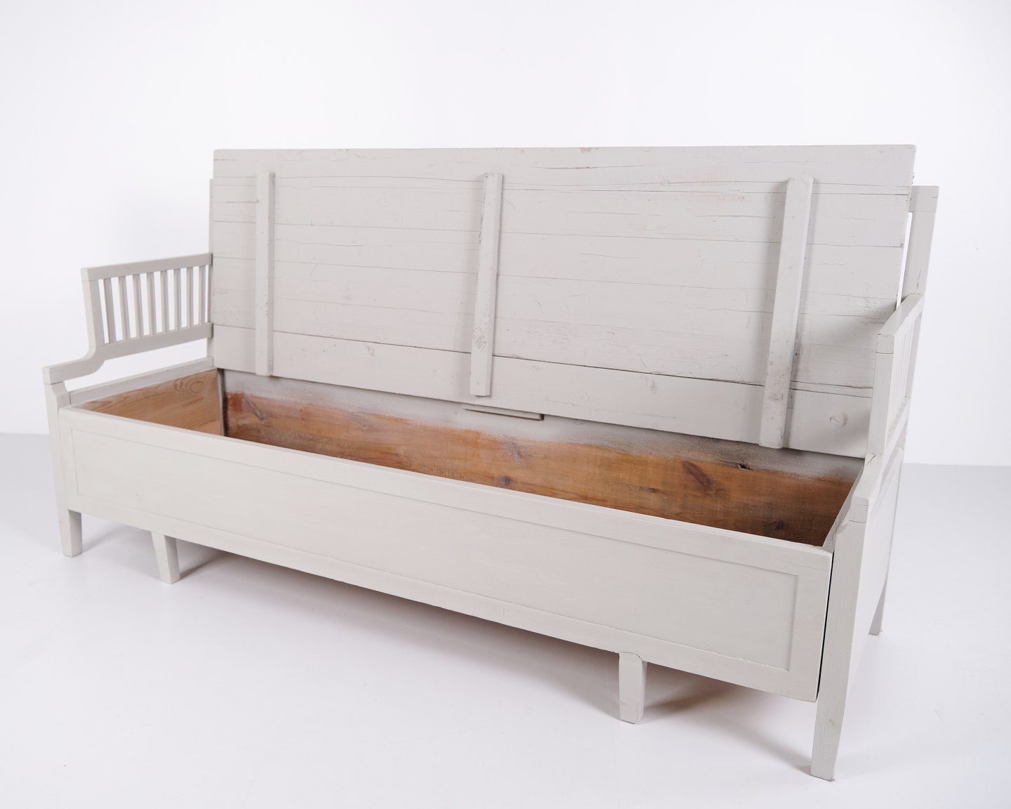 Antique storage bench from the 1860s in grey-painted pine wood with high back and storage. Antique storage bench from the 19th century.