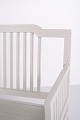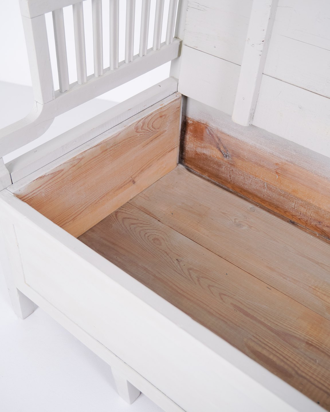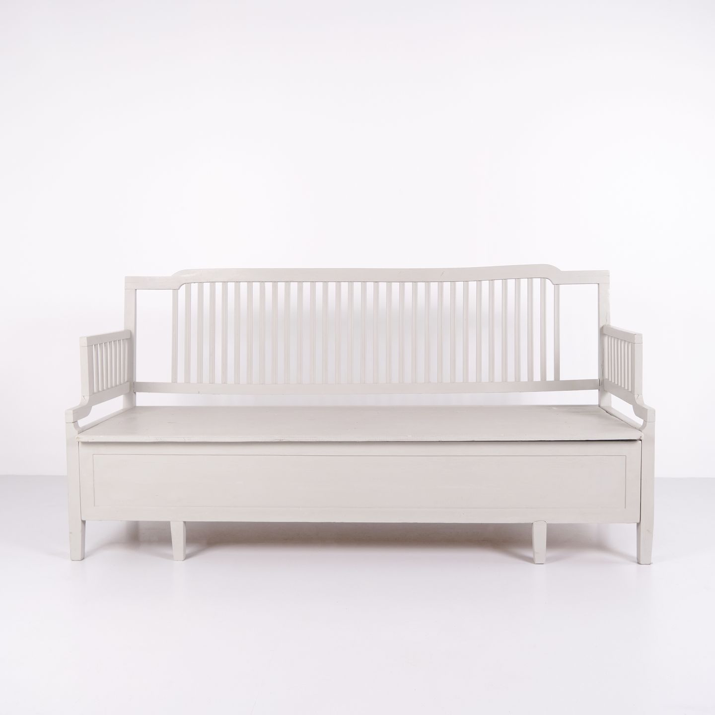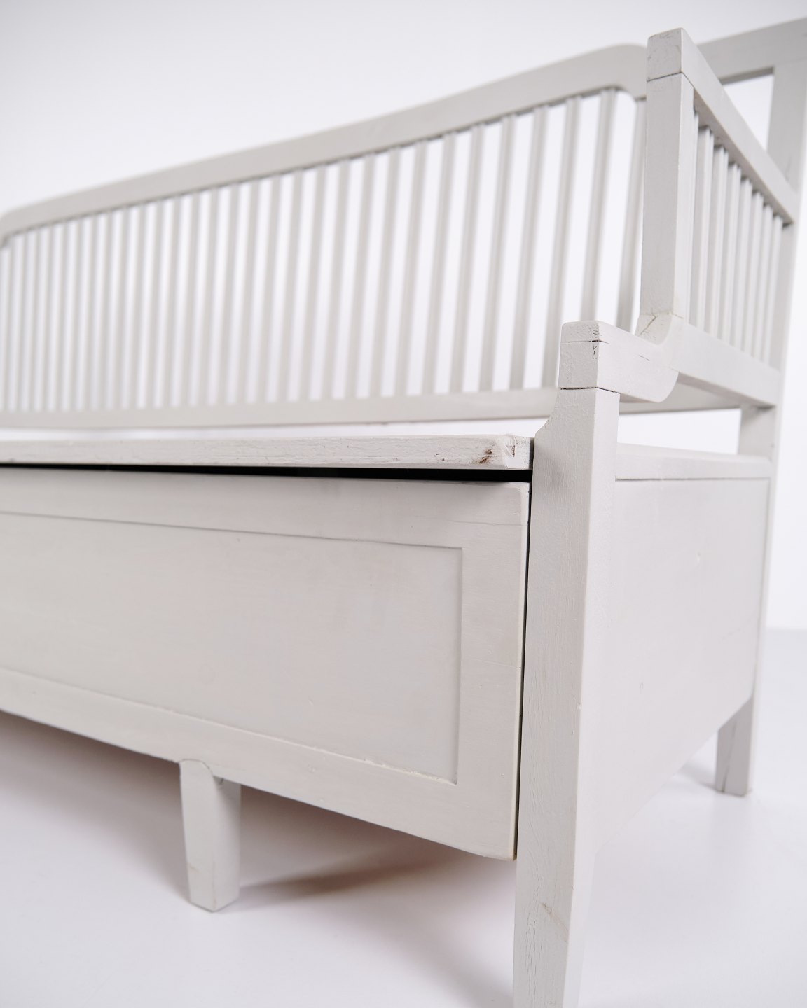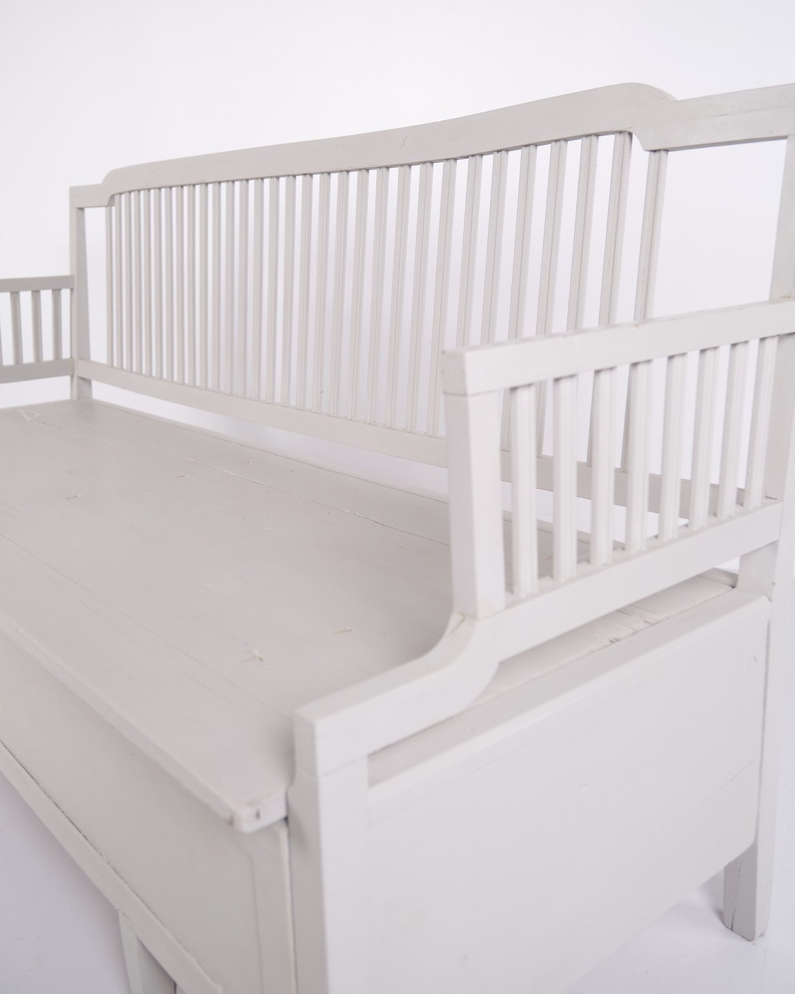 Antique storage bench from the 1860s in grey-painted pine wood with high back and storage. Antique storage bench from the 19th century.