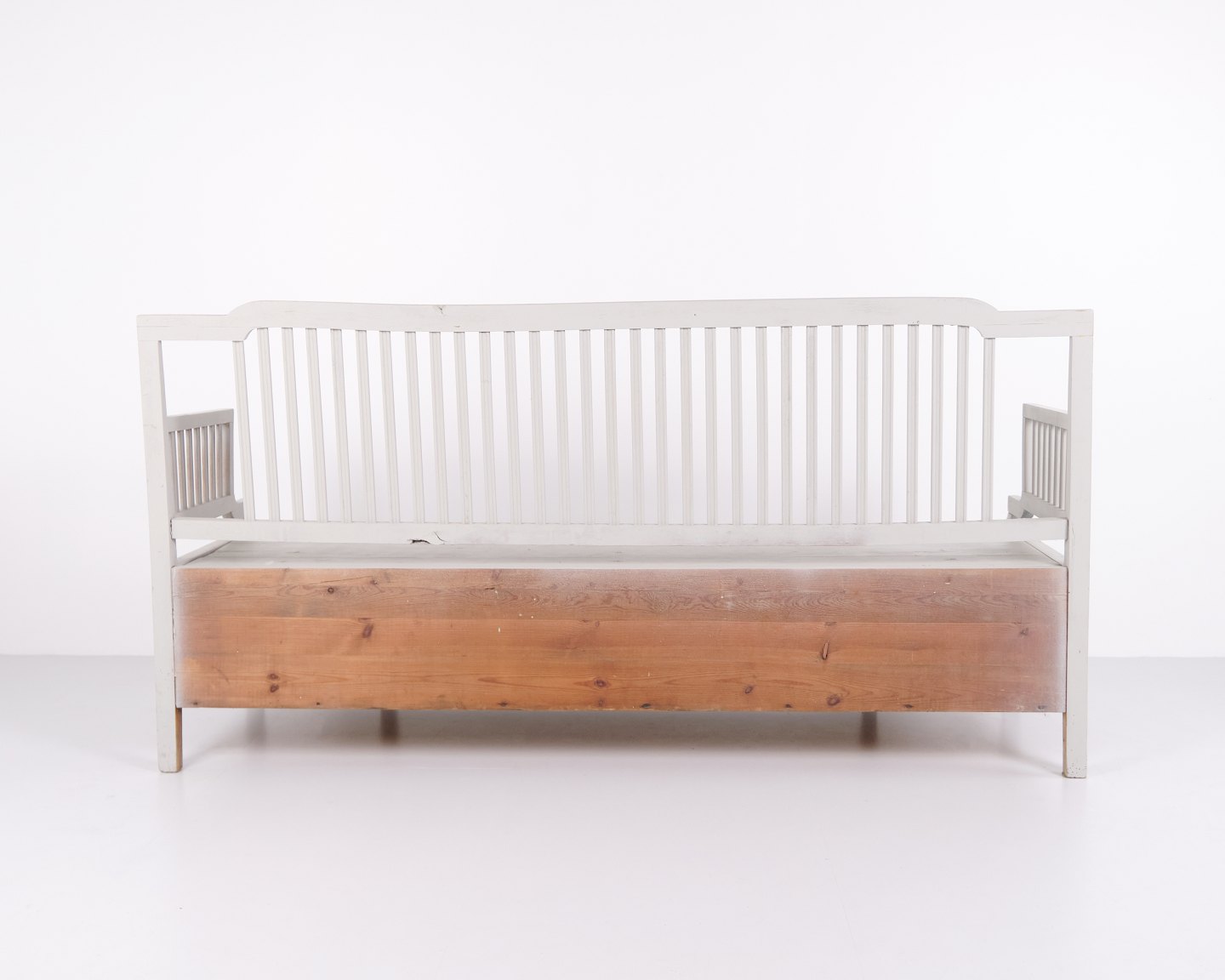 Antique Storage Bench With High Back – Grey Painted – Pine Wood – 1860s