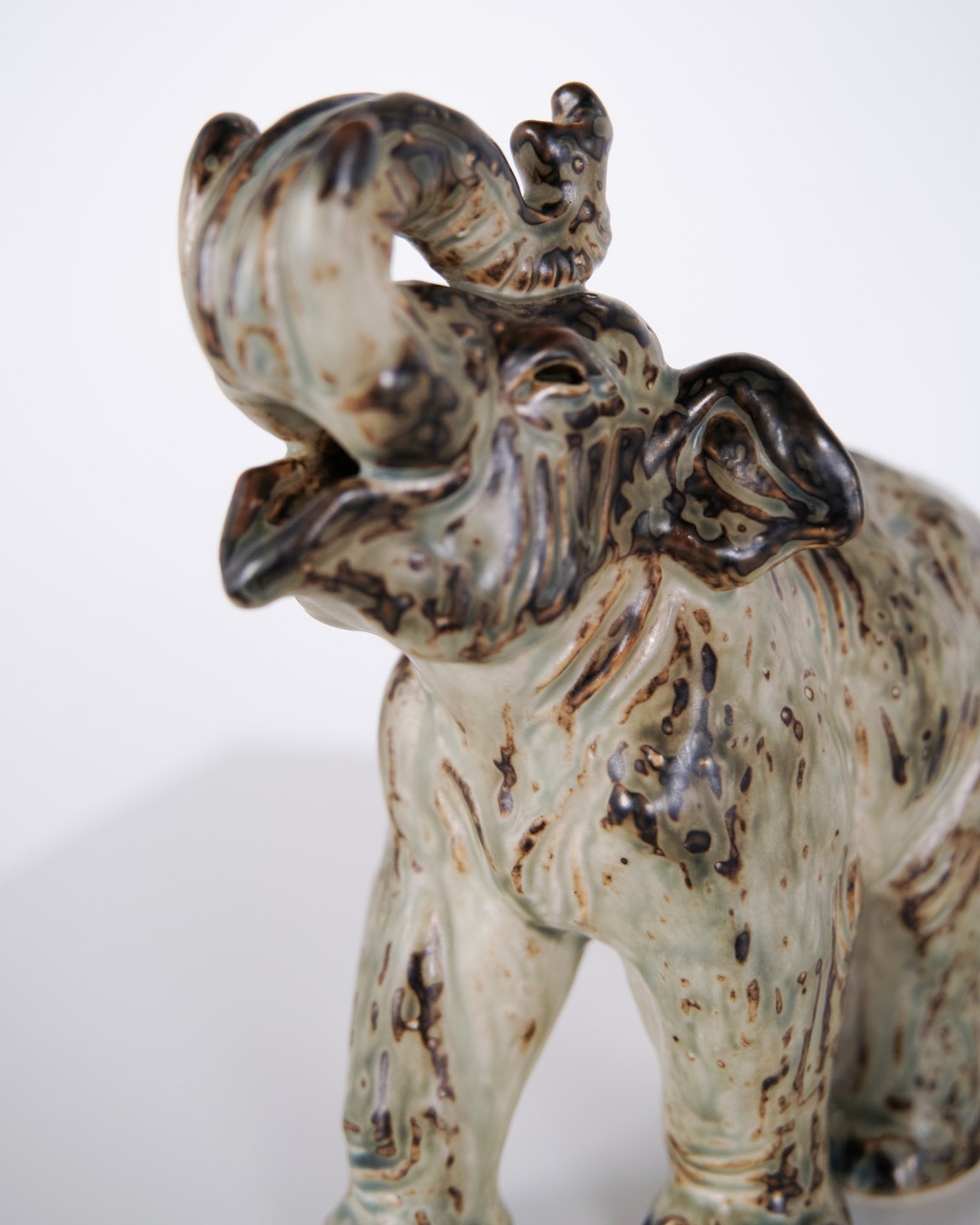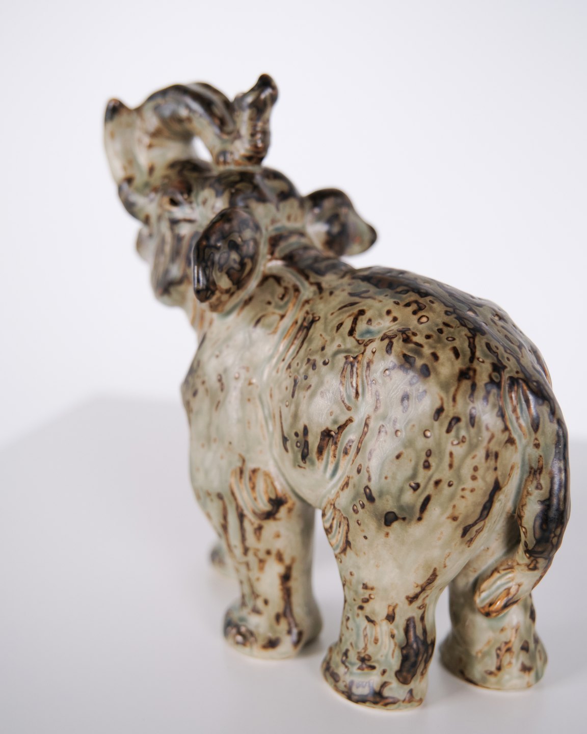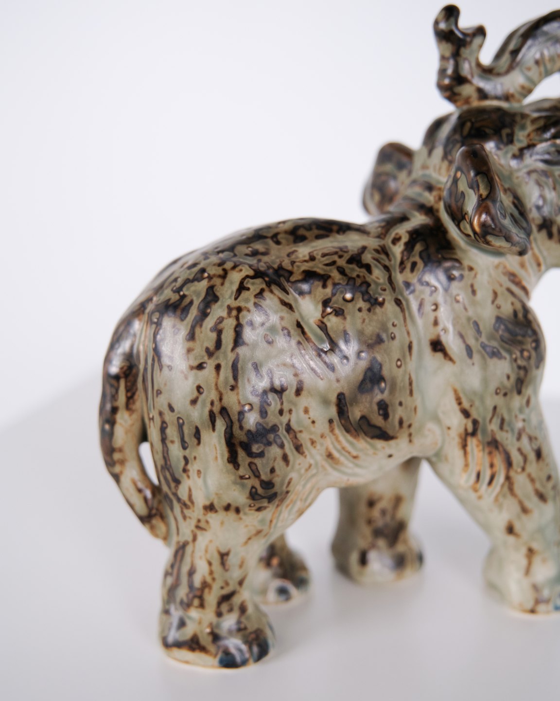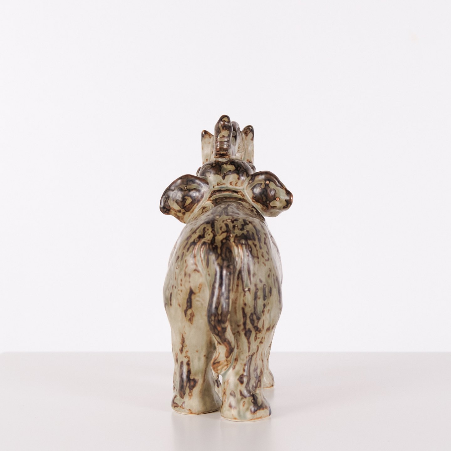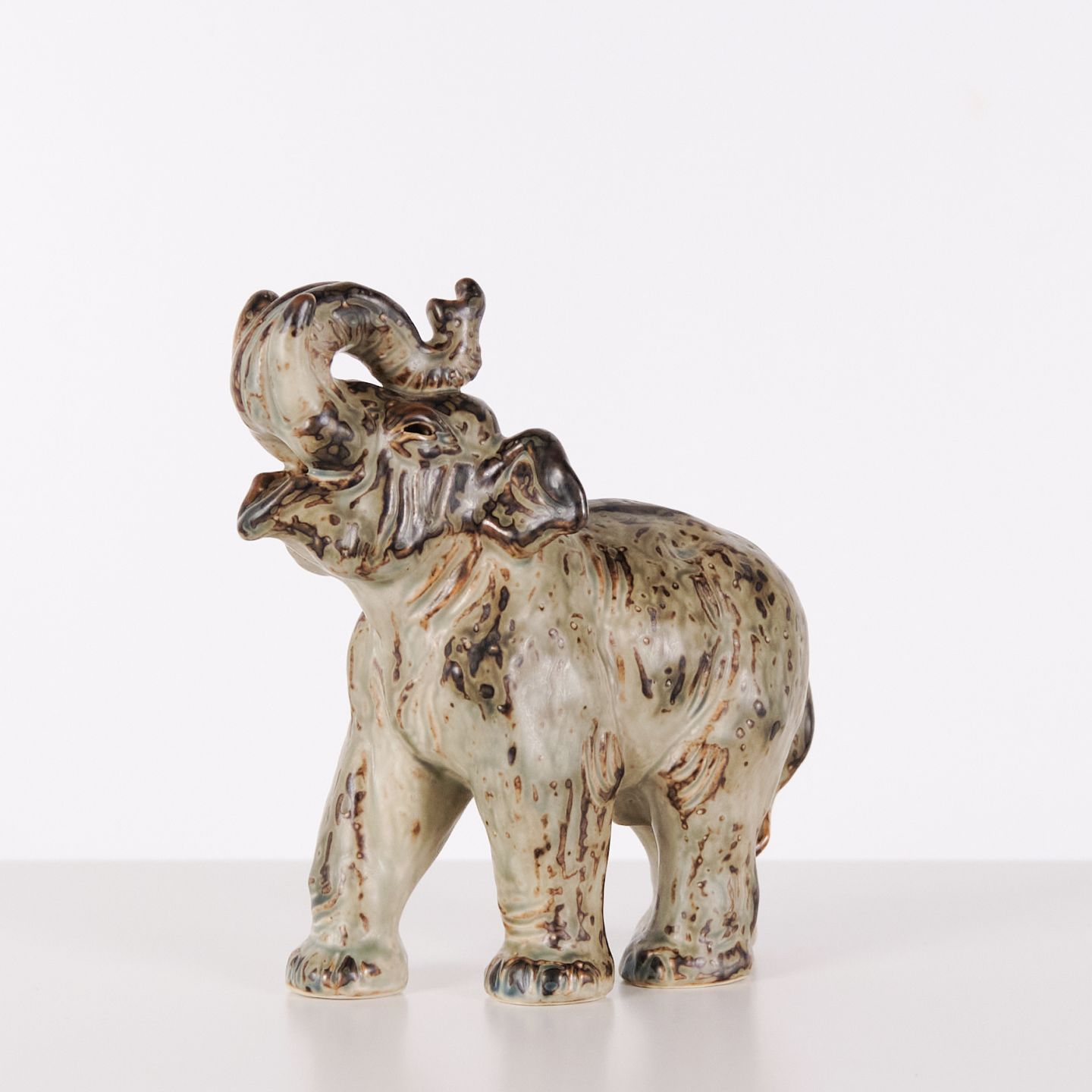 Stoneware figure depicting a standing elephant, model 21517, designed by Knud Kyhn for Royal Copenhagen. The figure is made of stoneware and reflects Kyhn’s well-known work with animal sculptures, produced at Royal Copenhagen primarily from the 1930s onwards. Kyhn’s designs are recognised for their solid form and material character and are sought after by collectors of Danish ceramics.