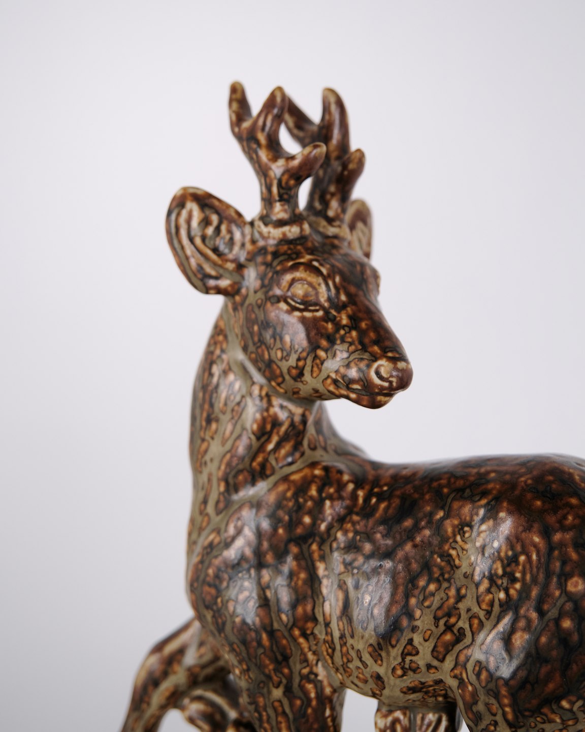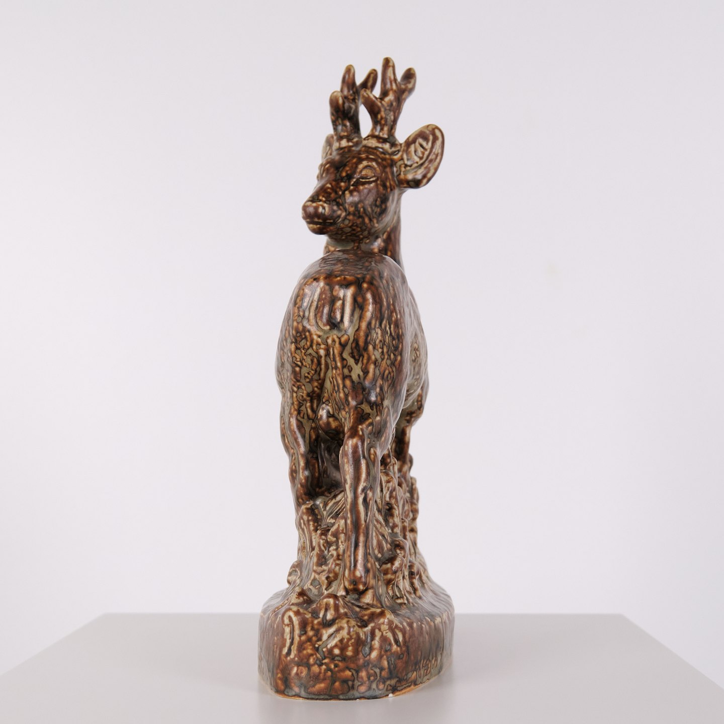 Stoneware figure depicting a standing deer, model no. 21333, designed by Knud Kyhn for Royal Copenhagen. The figure is executed in stoneware and belongs to Kyhn’s animal sculptures produced at Royal Copenhagen in the mid-20th century.