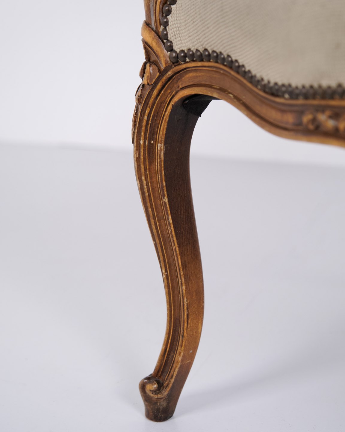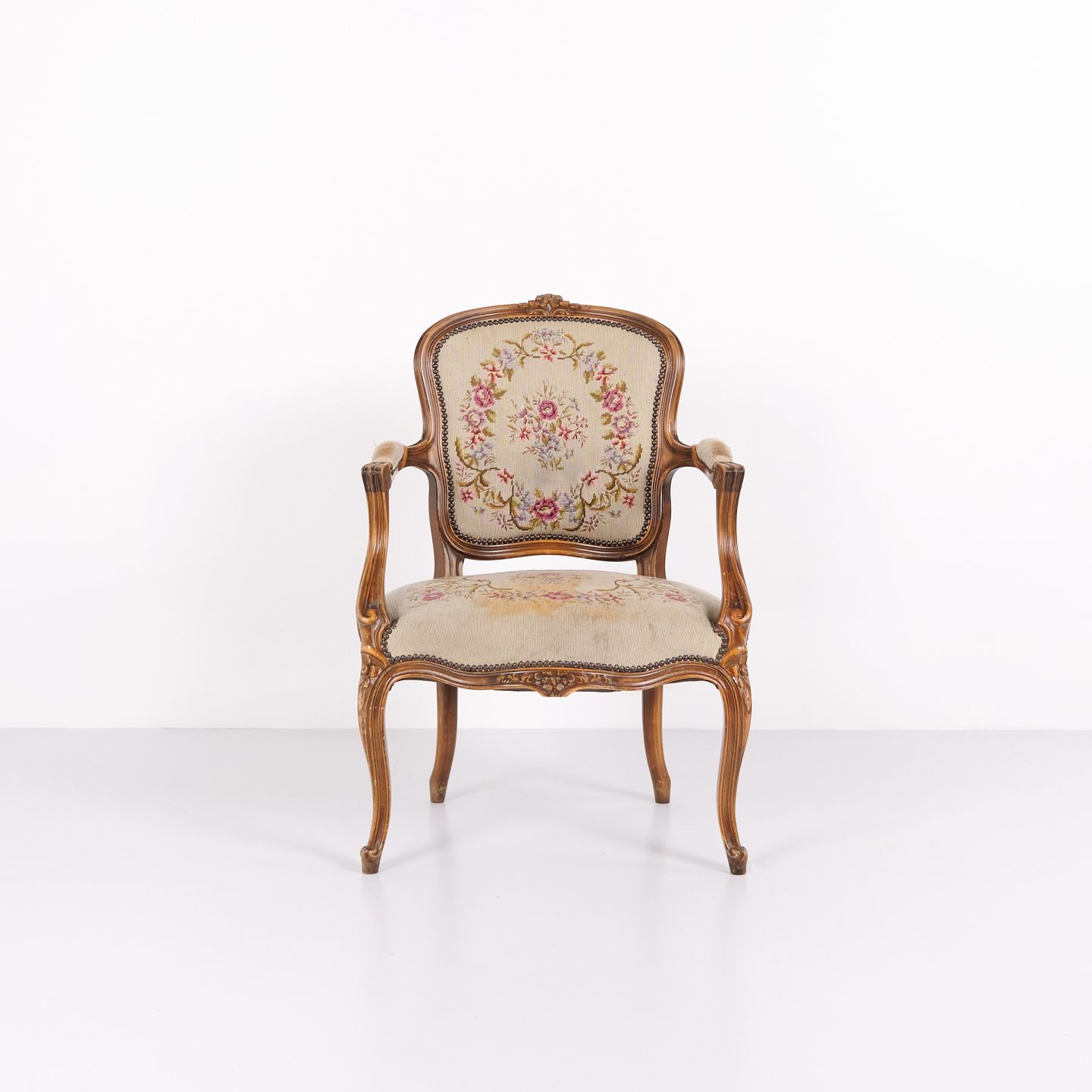 Neo-Rococo armchair from the 1930s with curved legs and floral fabric. Classic and decorative piece of furniture with a romantic expression.