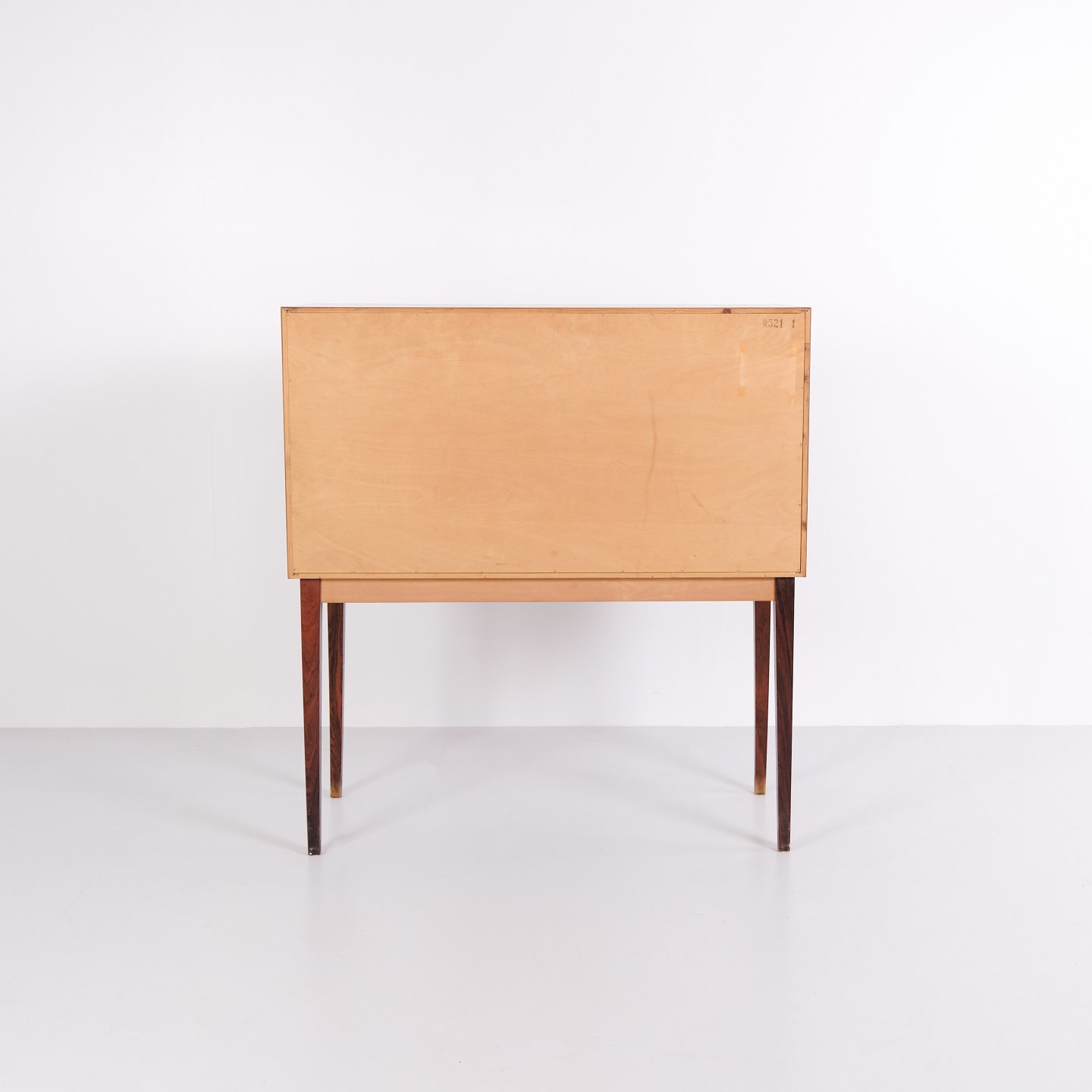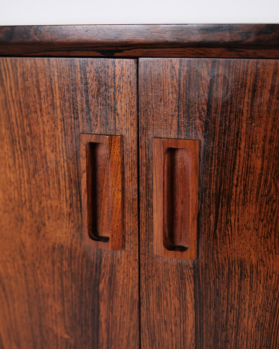Der Schrank verfügt über praktische Aufbewahrungsmöglichkeiten, darunter ausziehbare Ablagen an der Vorderseite sowie eine verstellbare Einlegeplatte im Inneren. Das Möbel zeigt eine schöne Palisanderfurnieroberfläche und trägt den Stempel der Bornholm Møbelfabrik mit Modellnummer auf der Rückseite.