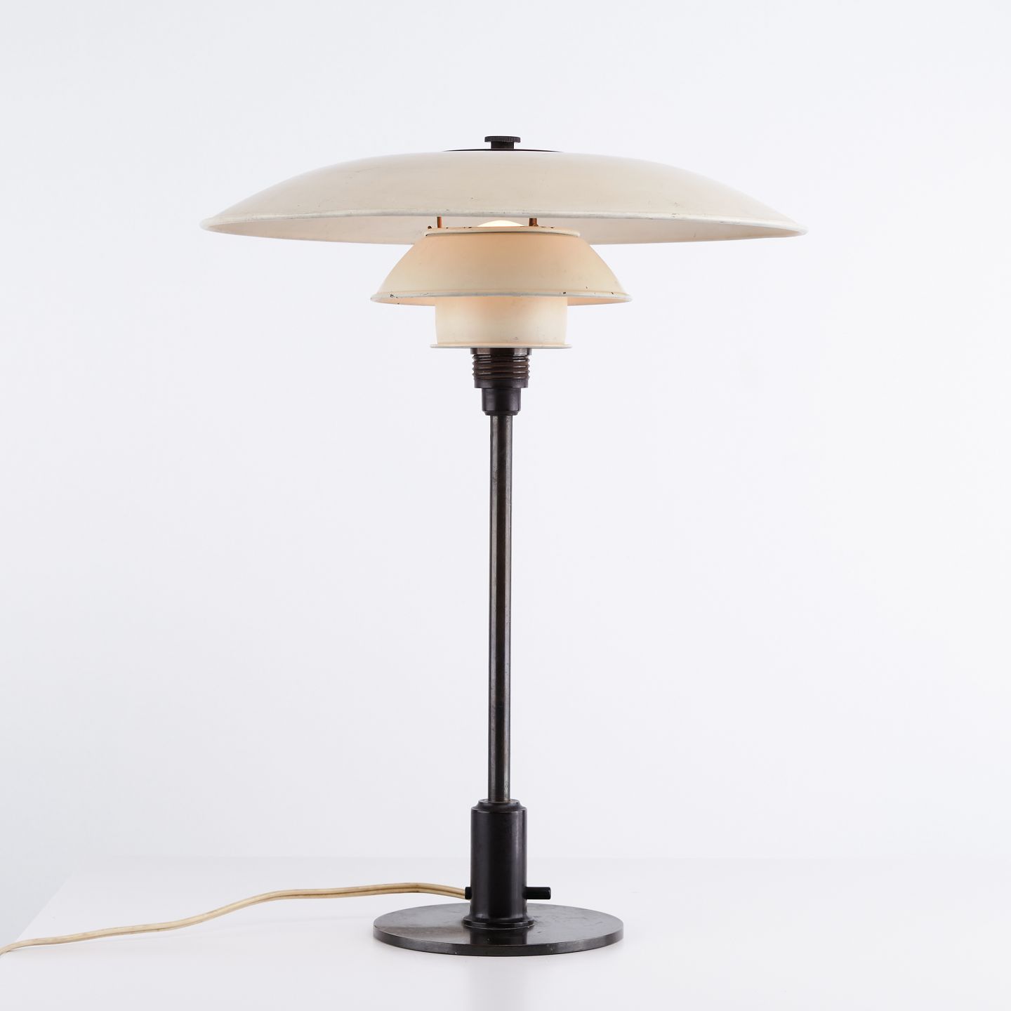 PH 3.5/2.5 table lamp designed by Poul Henningsen and produced by Louis Poulsen in the 1930s. The lamp is made with white painted metal shades, ensuring a soft and evenly distributed light.