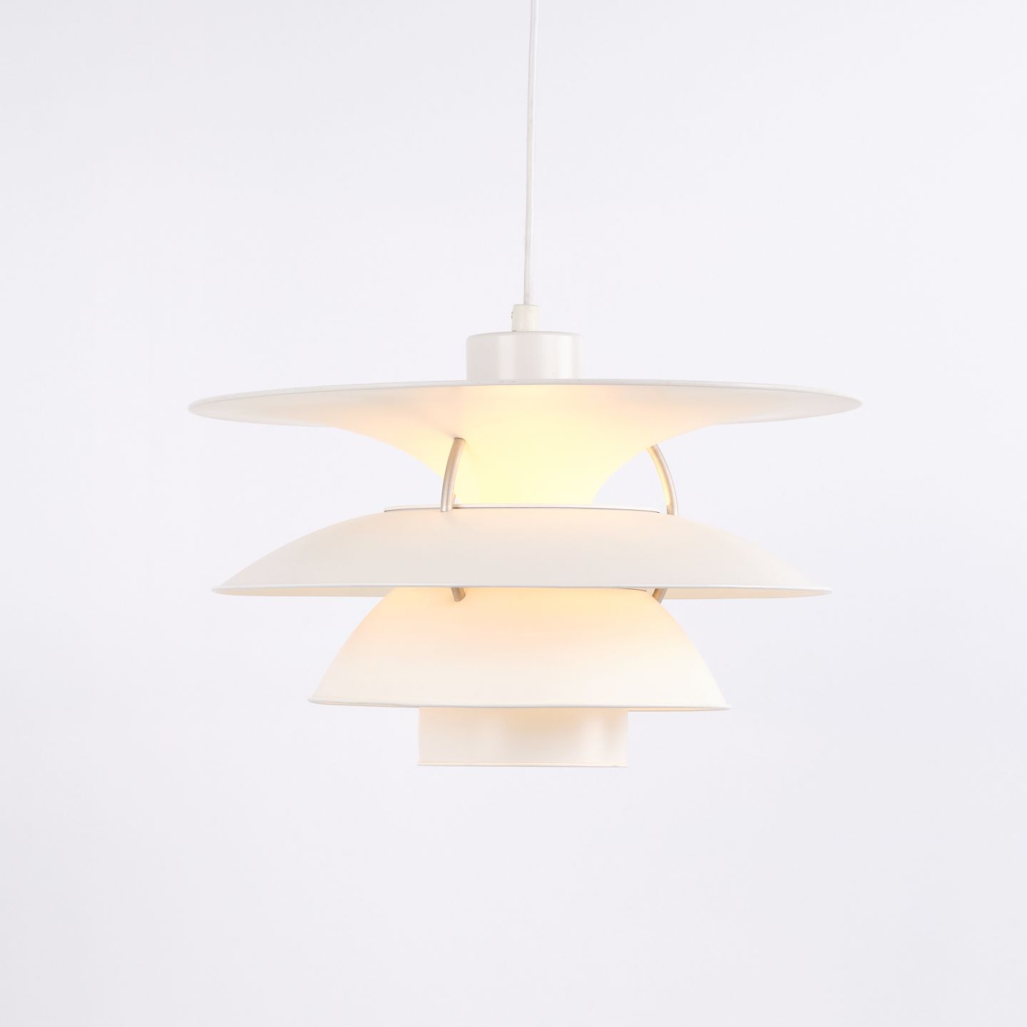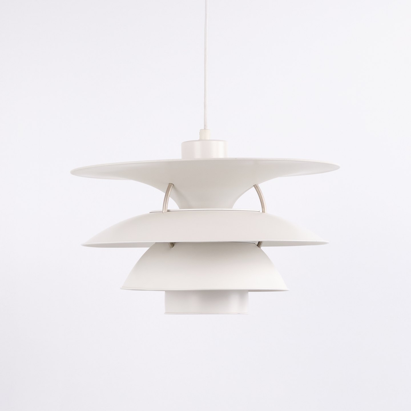 Charlottenborg pendant, model PH 5-4½, designed by Poul Henningsen and produced by Louis Poulsen in the 1980s. The lamp is based on the 4-shade system introduced in 1931 with the purpose of increasing light output and creating more efficient illumination in the room. The construction directs a greater amount of light horizontally, providing better lighting of walls and surroundings compared to traditional 3-shade lamps.
