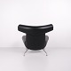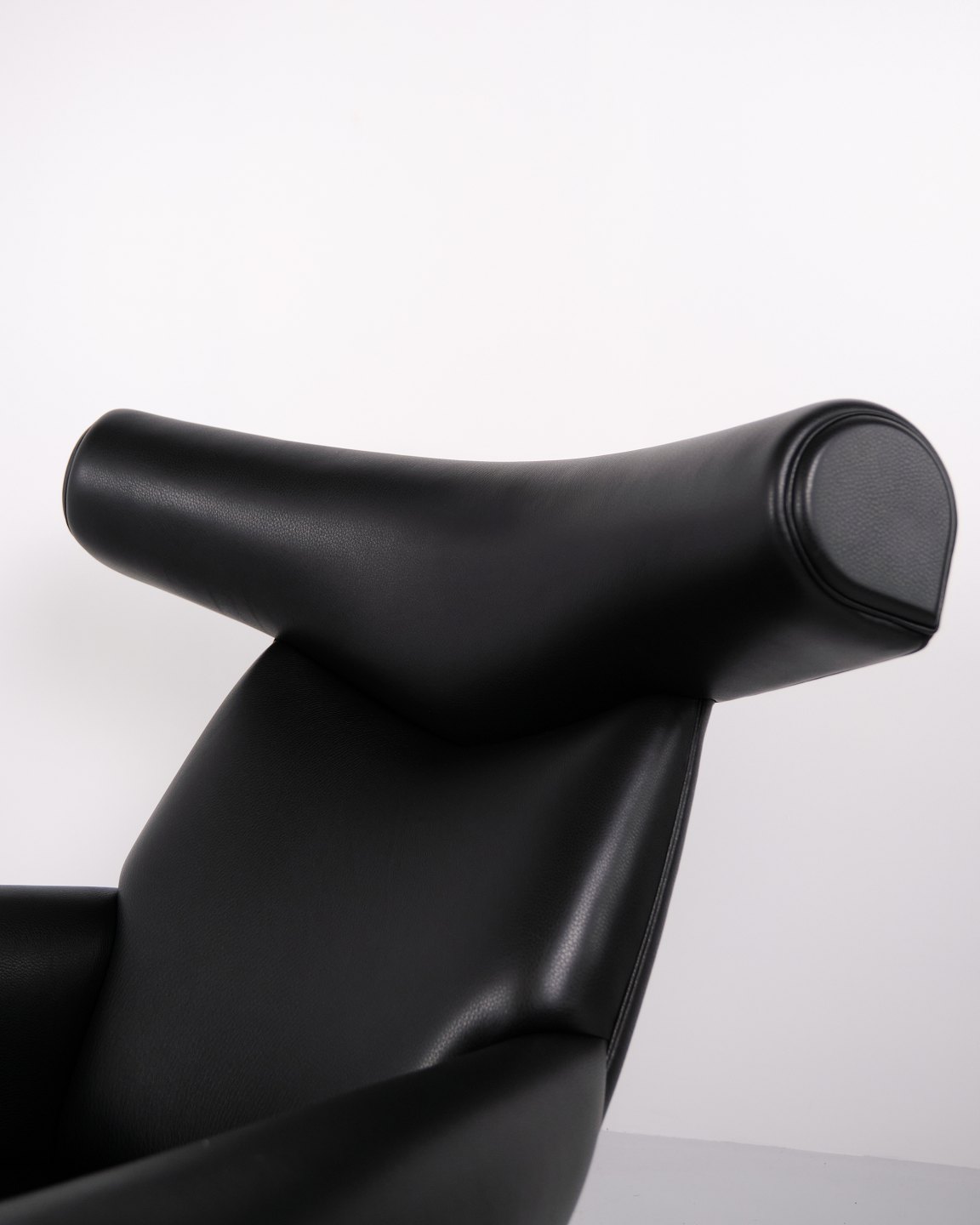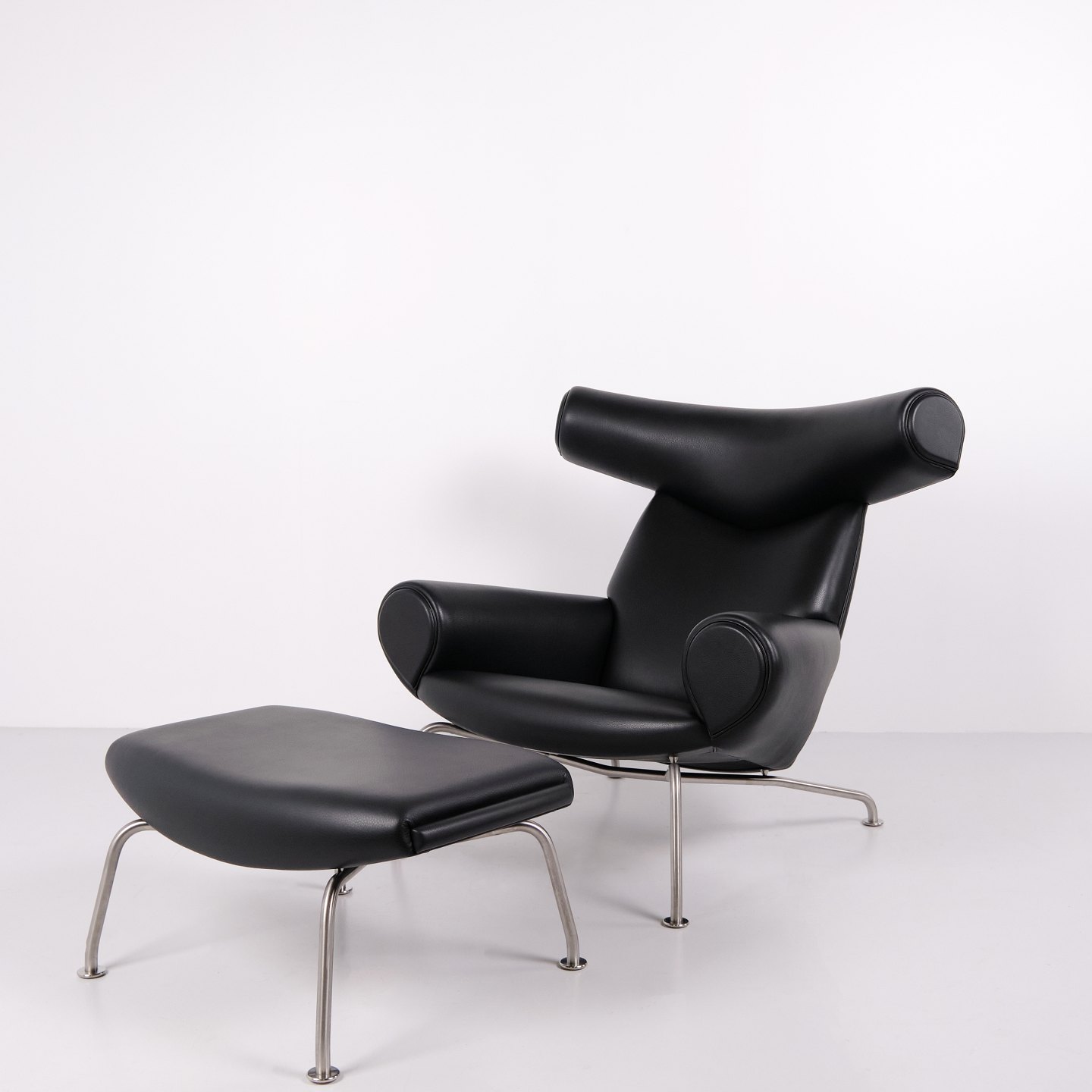 Ox Chair model EJ100 with matching ottoman designed by Hans J. Wegner. The model was designed in 1960 and is produced today by Fredericia Furniture following the acquisition of Erik Jørgensen. Upholstered in black leather with steel frame. The distinctive backrest with “horns” gave the chair its name Ox Chair. The design is considered one of Wegner’s most sculptural works and differs from many of his other chairs through its bold and organic form. The Ox Chair is represented in international collections and is among the most recognized Danish lounge chairs of the period.