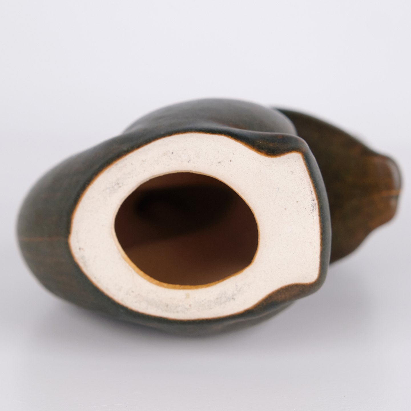 Ceramic squirrel figure by Knud Basse made in dark glaze with warm brown tones. The figure depicts a seated squirrel with nut and features marked organic lines characteristic of Danish studio pottery from the period. Knud Basse figures are known collector’s items within Danish animal ceramics.