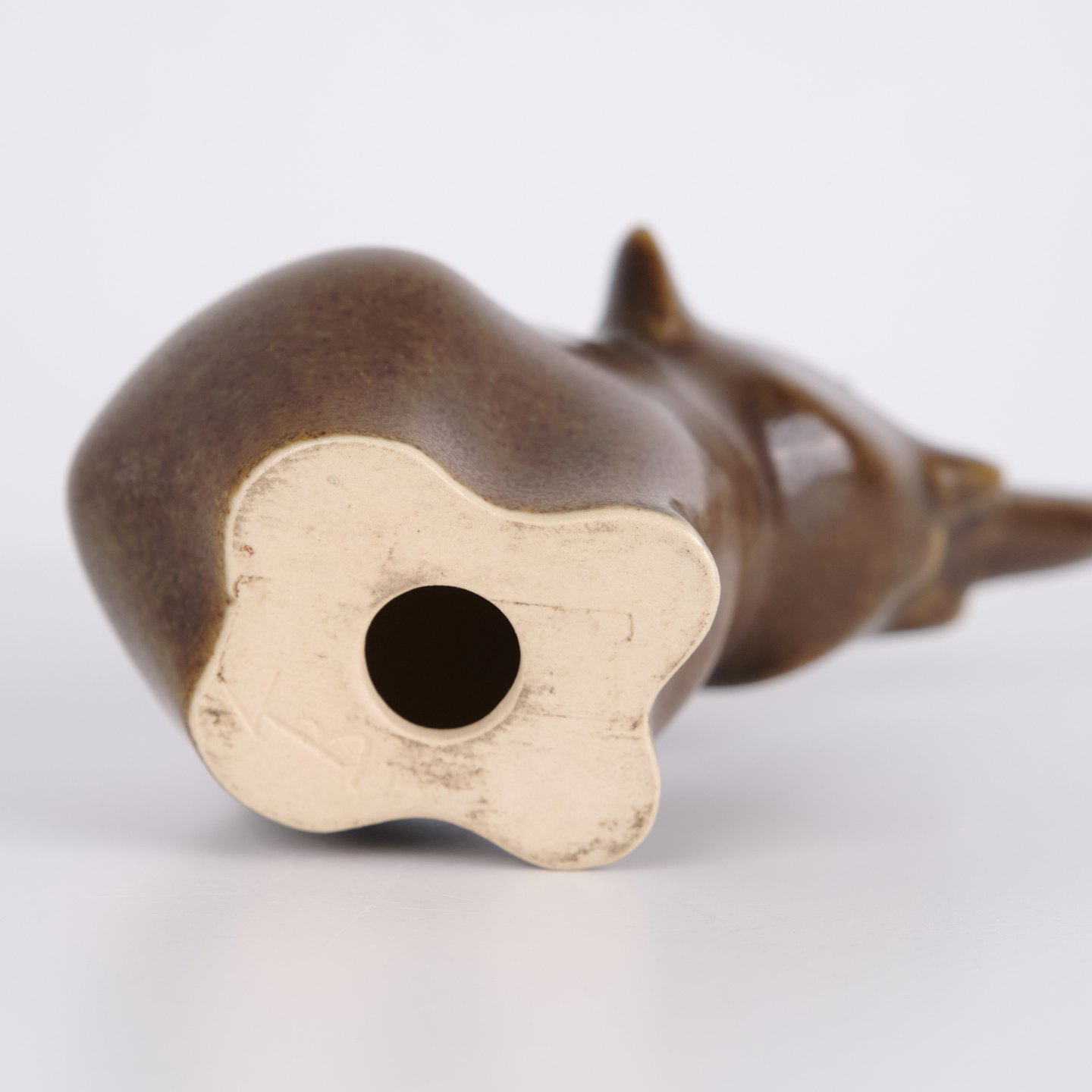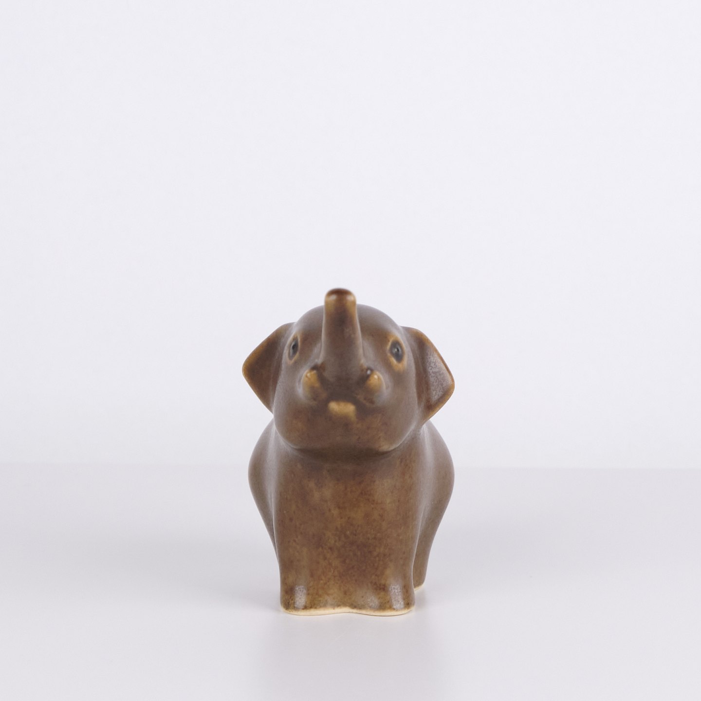 Elephant figure by Knud Basse made in brown glazed ceramic. The figure is modeled with raised trunk and rounded forms, creating a lively and decorative expression. A classic example of Danish animal ceramics, where simple lines and characterful motifs are central. Sought-after figure among collectors of Knud Basse and Danish ceramics.