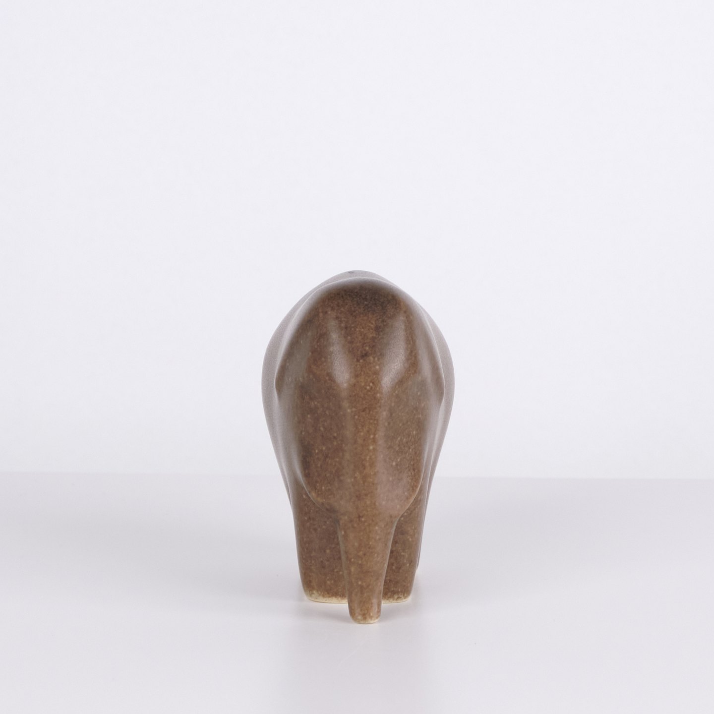 Elephant figure by Knud Basse made in brown glazed ceramic. The figure is modeled in a simple compact form with downward curved trunk and rounded sides. Minimalist model from Knud Basse’s series of animal figures, produced in Denmark in the 1960s.