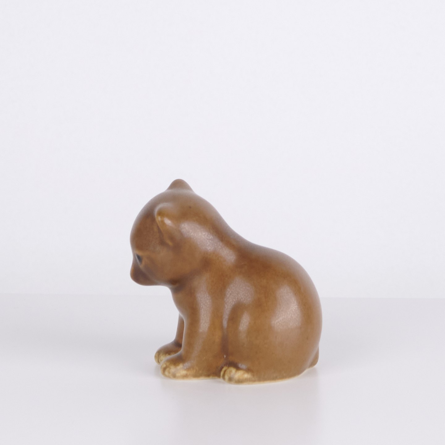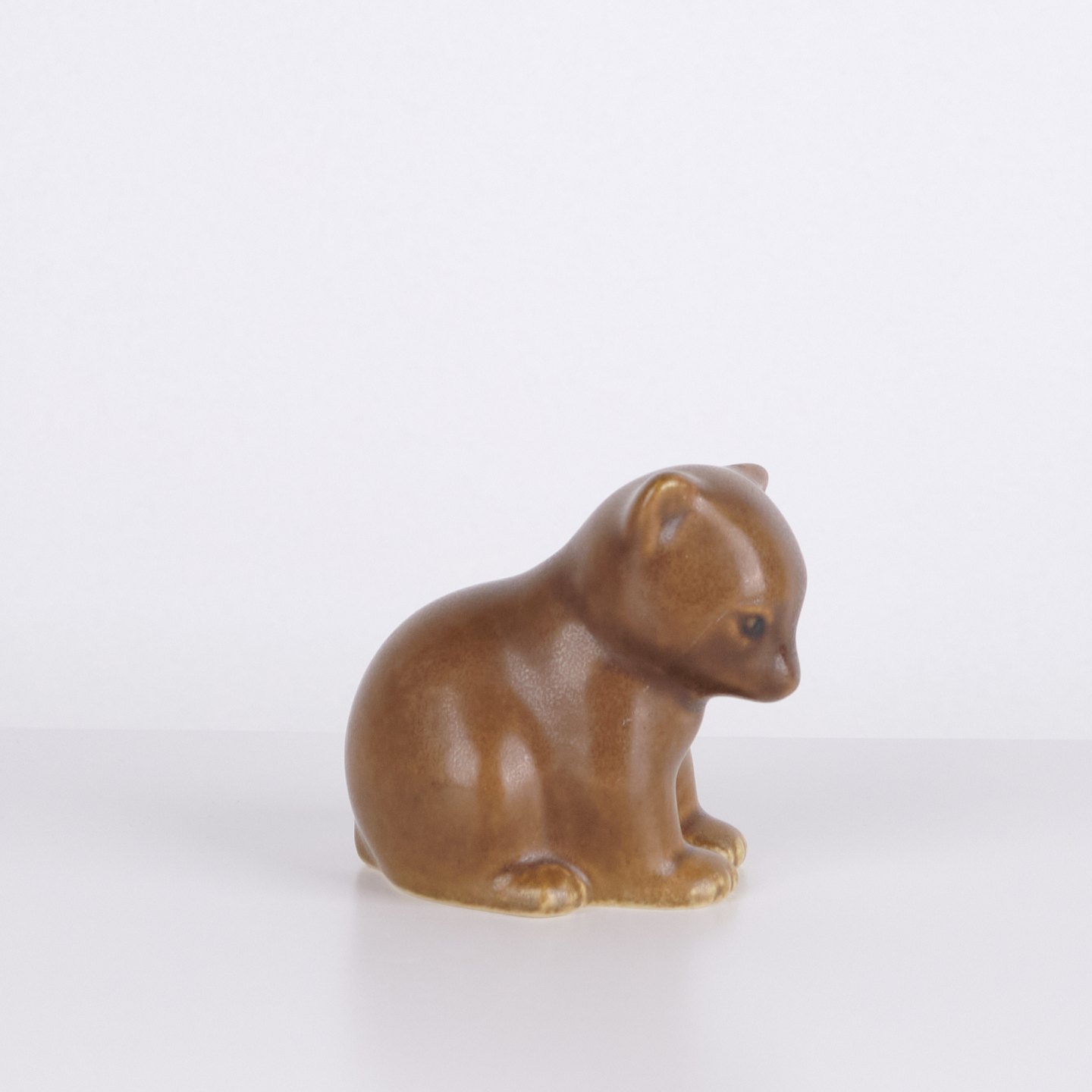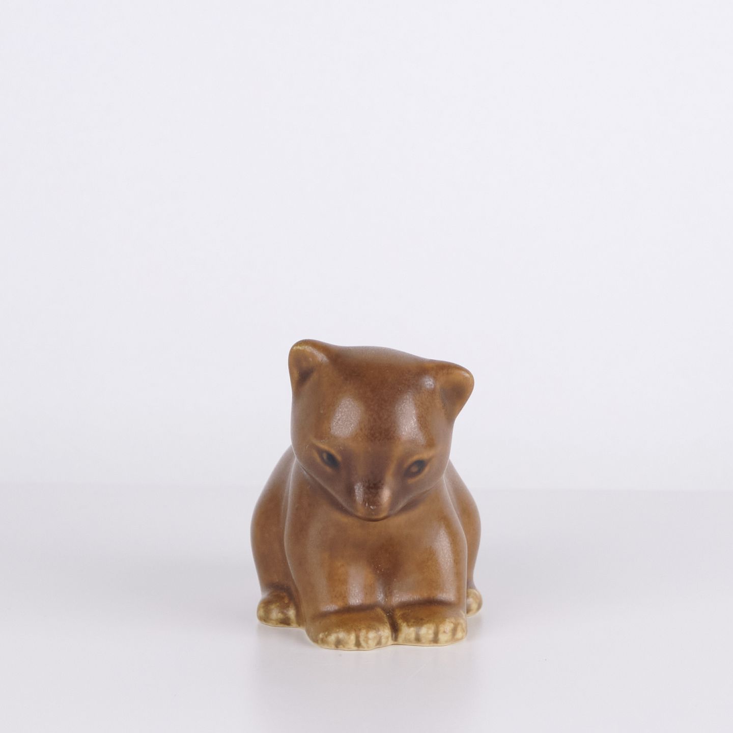 Bear figure by Knud Basse made in light brown glazed ceramic. The figure shows a seated bear with lowered head, defined paws and soft organic forms. A classic smaller model from Knud Basse’s series of animal figures produced in Denmark in the 1960s.