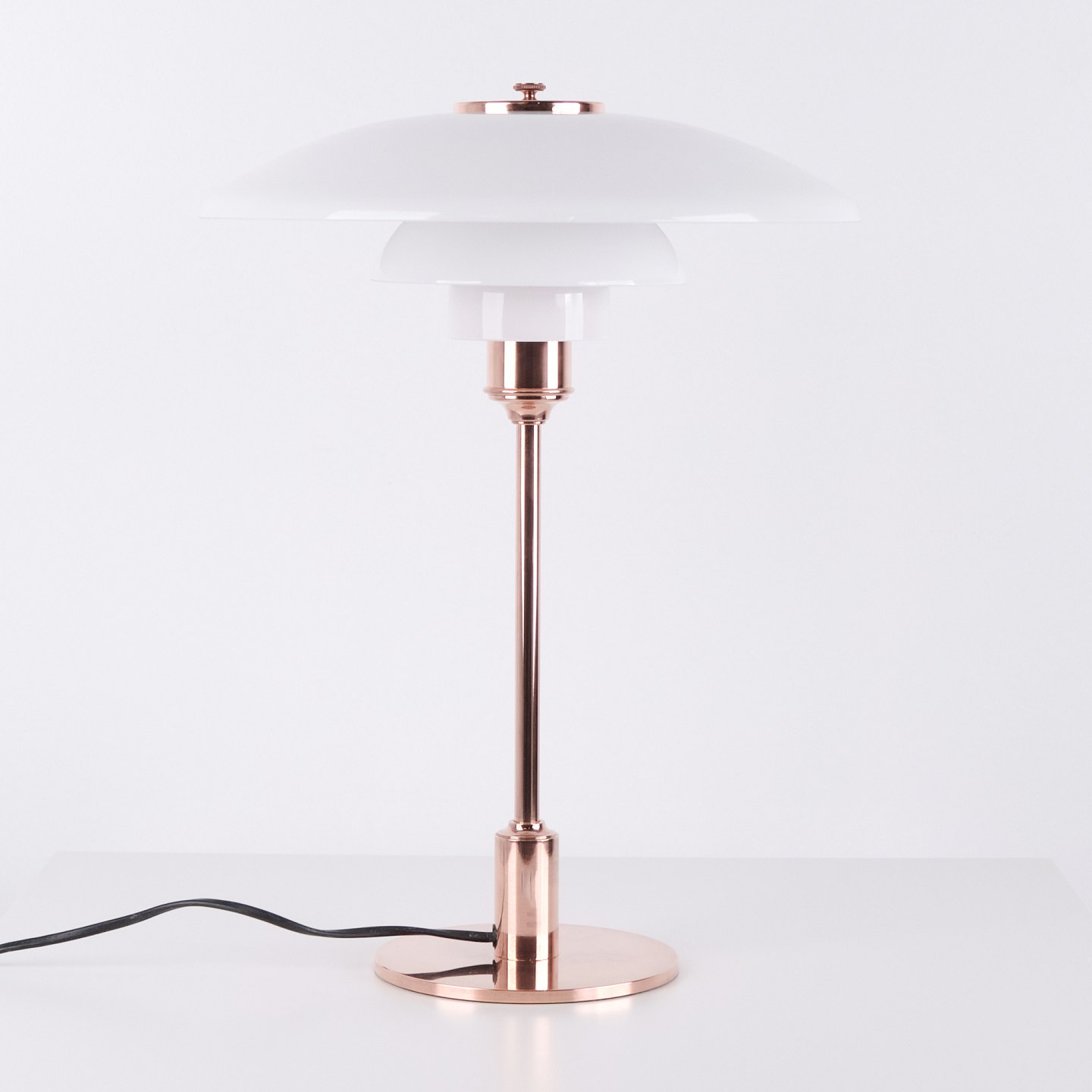 PH table lamp model PH 3½-2½ Limited Edition designed by Poul Henningsen and manufactured by Louis Poulsen. The lamp is made of copper with top shade in white opal glass and two lower shades in white opal glass. The model was sold for a limited period in 2015.