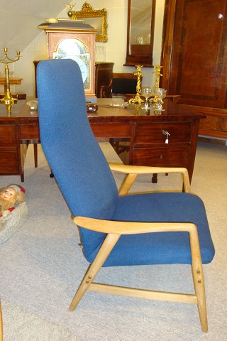 A lounge chair design Alf Svensson produced by Fritz Hansen model 4312. with adjustable back and seat. The chair is upholstered in blue wool hallingdal and the tree of light elm. The chair is in good used condition.