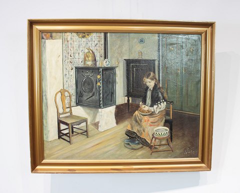Oliemaleri med skov motiv og sort ramme fra 1997 med ukendt signatur.