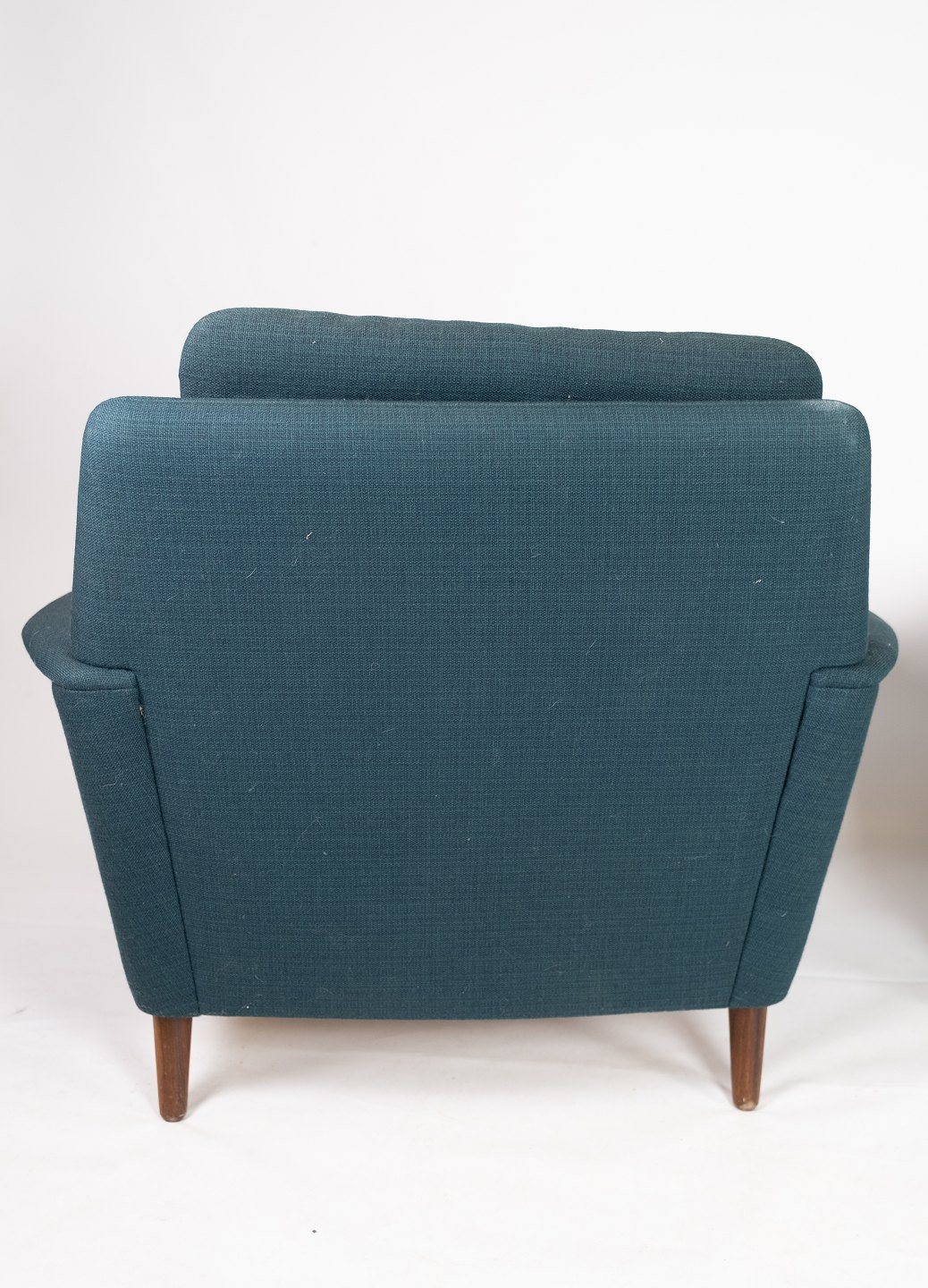 This set of armchairs from the 1960s is an example of the timeless elegance that characterizes Fritz Hansen's design. The chairs are beautifully upholstered with dark turquoise woolen fabric that adds both style and comfort. The elegant construction of the legs in rosewood gives a luxurious and warm expression that fits perfectly with any modern or classic decor. With their subtle curves and artisan details, these chairs are both functional and beautiful. Fritz Hansen is behind this set of armchairs and thus guarantees exceptional quality and timeless design.