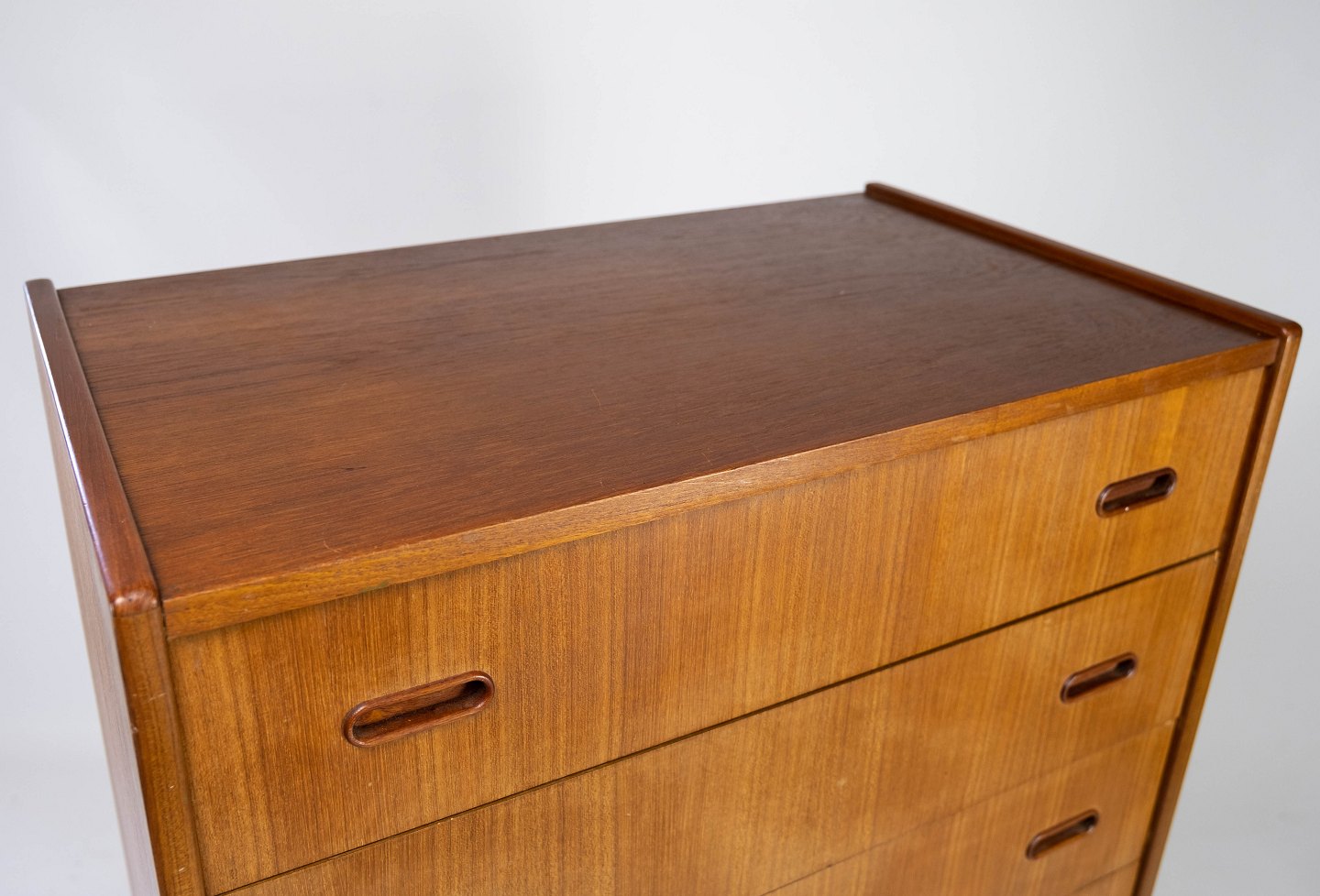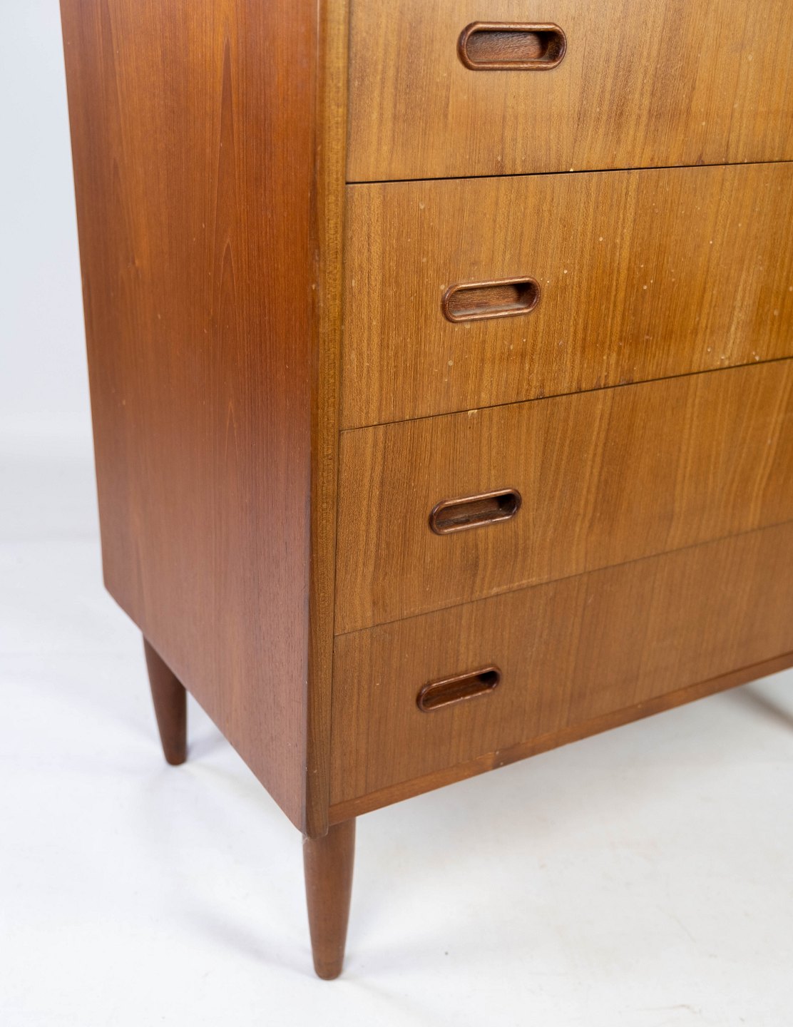 This teak chest of drawers, designed by Danish craftsmen around 1960, is a classic example of Danish furniture design from this era. The teak wood adds a warm and natural tone to the furniture and at the same time brings a feeling of durability and timelessness.