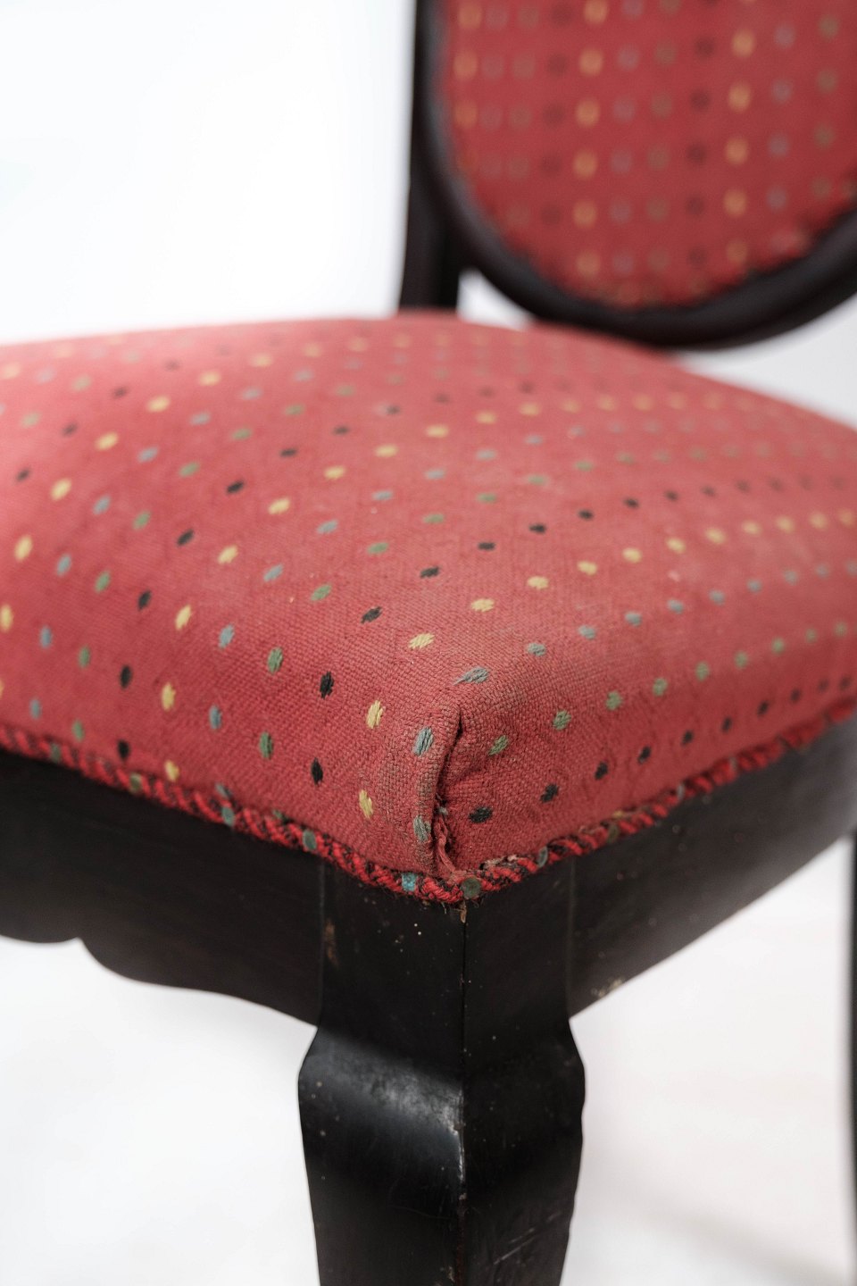 Set of three dining room chairs of mahogany and upholstered with red fabric from around 1920. The chairs are in great vintage condition.