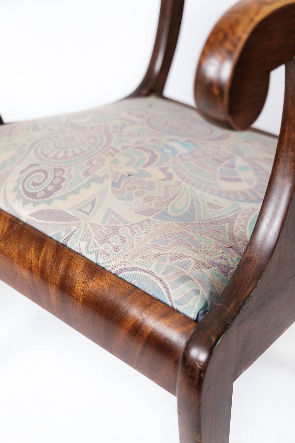 Empire antique armchair of mahogany and upholstered with light fabric from the 1840s.