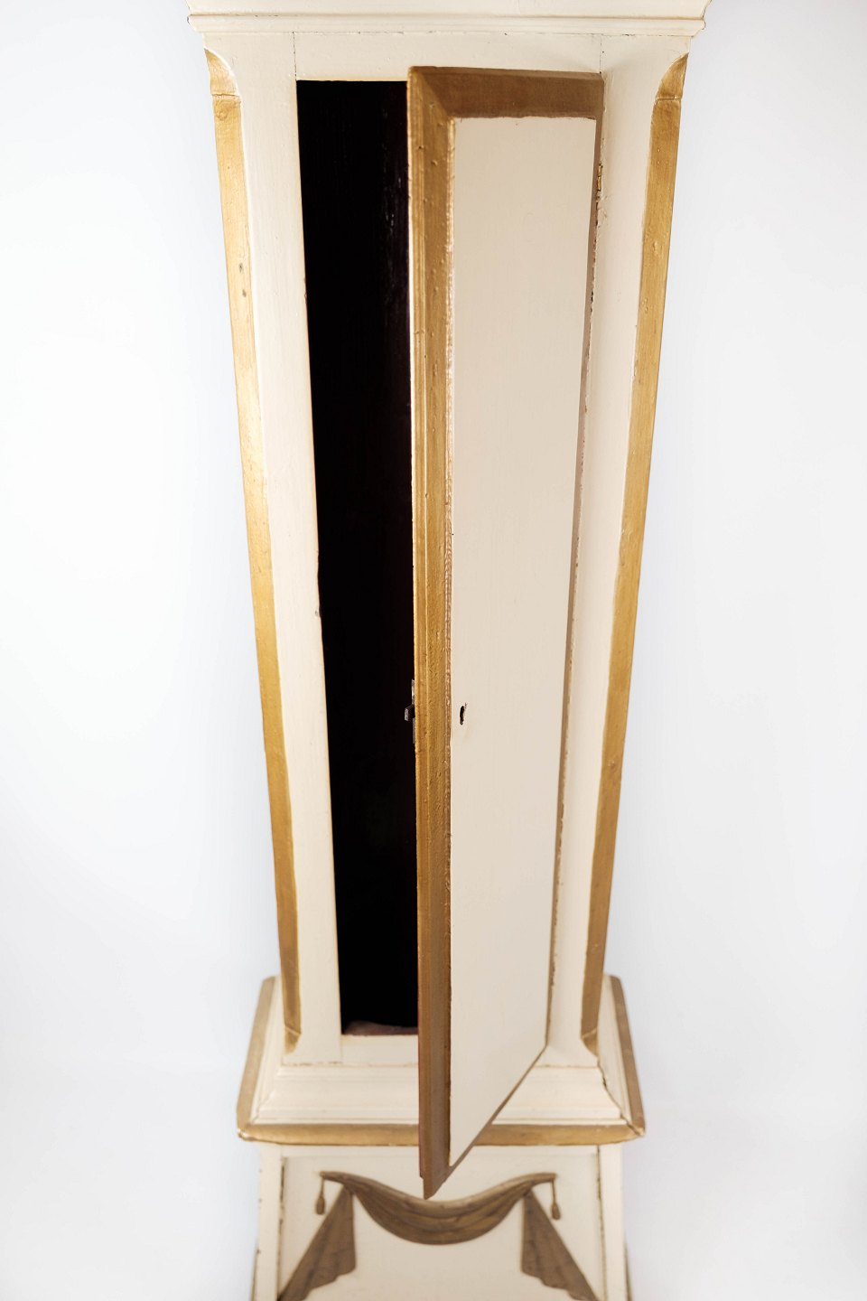 Grandfather clock of white painted wood decorated with gold from the 1820s.