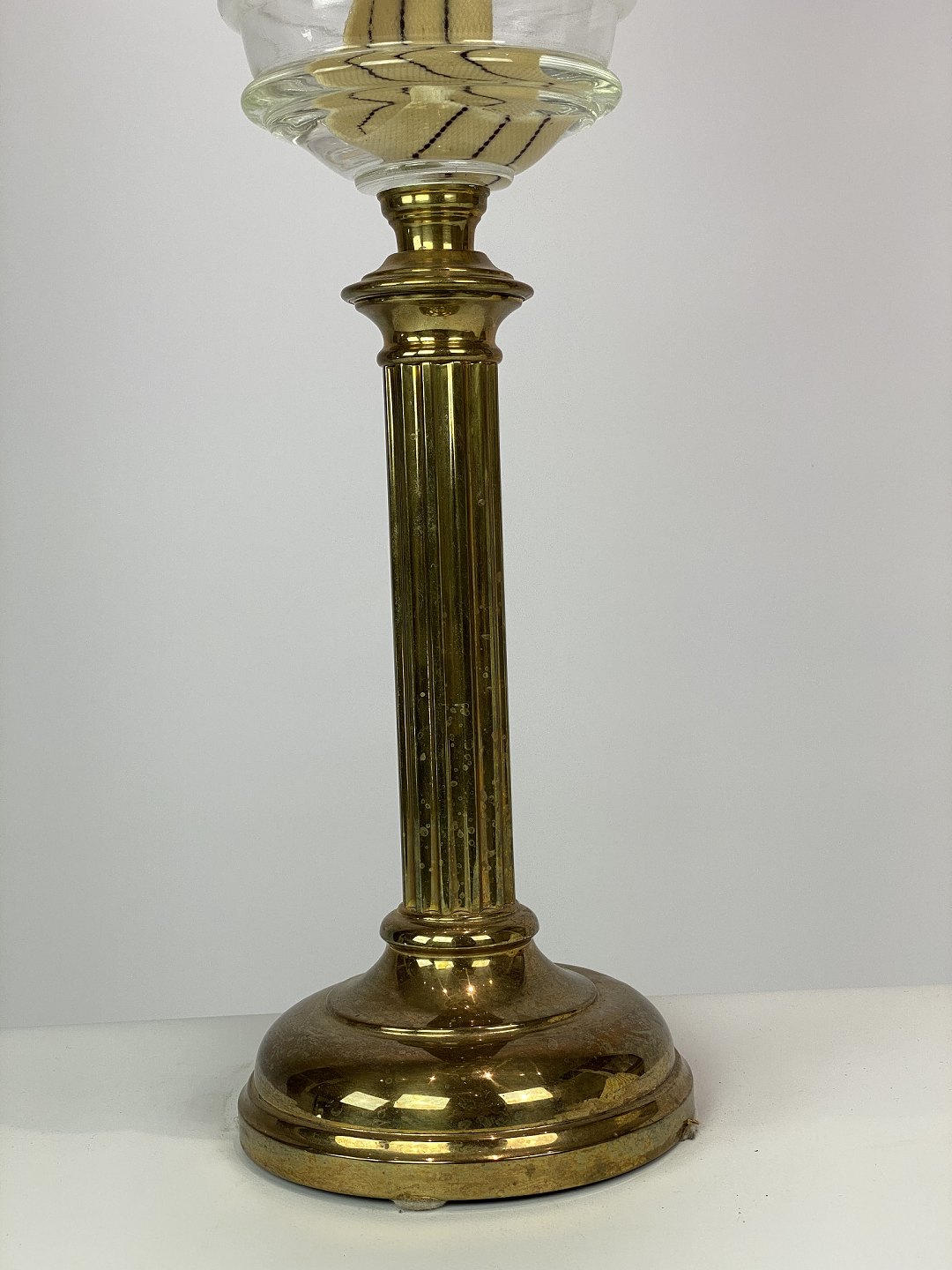 Kerosene lamp of brass with glass shade from around the 1860s.