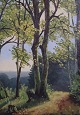 Oil painting on canvas with motif of forest with gold frame from around the year 1940s.