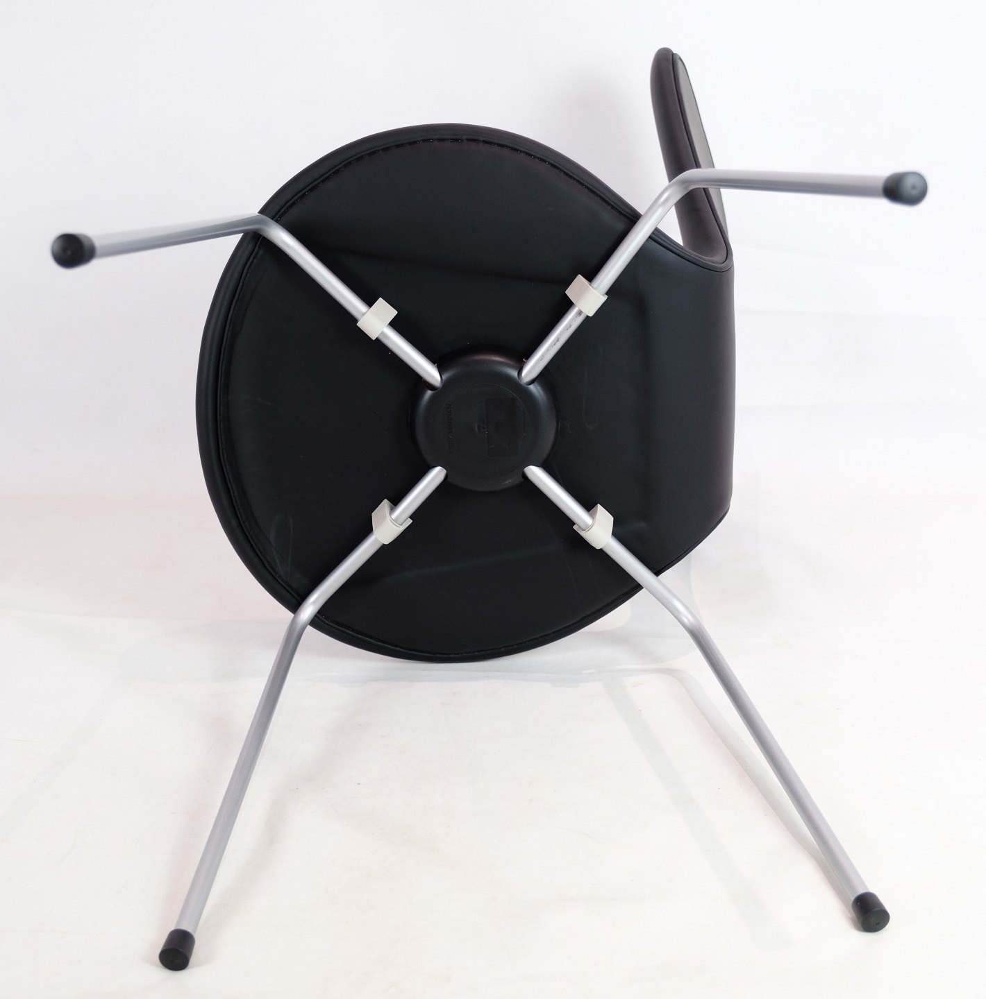 A set of 6 Seven chairs, model 3107, designed by Arne Jacobsen in 1967 and manufactured by Fritz Hansen. The chairs are newly upholstered in black elegance leather.