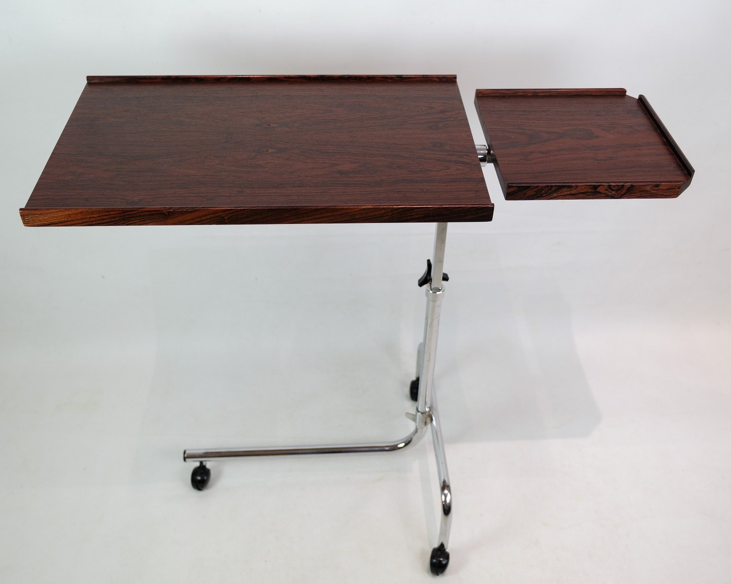 Justerbart sideboard i træsorten palisander med poleret stel af krom af dansk design fra omkring 1960'erne. Vil lave et flot sengebord, endebord, tv-bord eller arbejdsbord. Lille sidebord er aftageligt. Sidder på hjul for nem flytning.