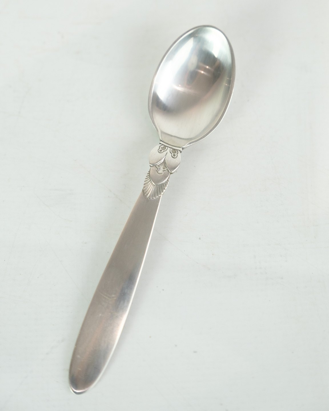 This Kaktus coffee spoon is a beautiful and practical addition to your coffee experience. Designed by Gundorph Albertus in 1930 and produced by Georg Jensen Sølvsmedie in Denmark, this spoon is marked with the well-known cactus pattern. Although in a nice used condition with normal signs of use, it will still bring a touch of elegance to your morning coffee. Our stock is limited, so please inquire about available quantities.