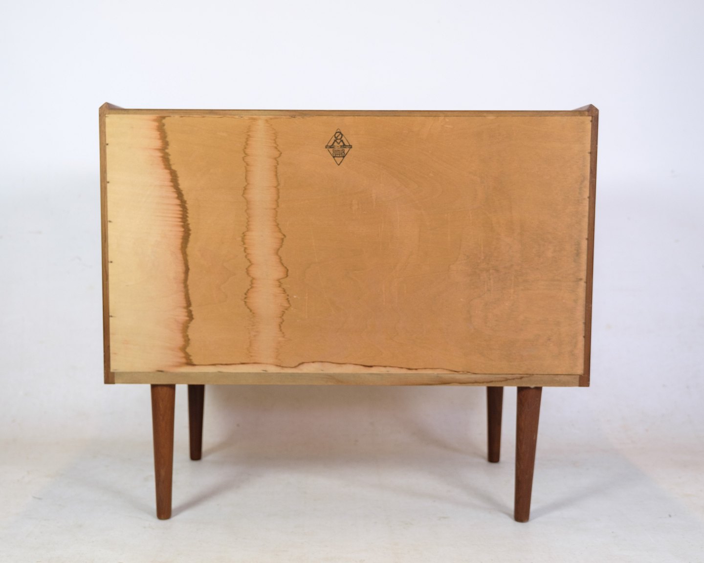 Dette sminkebord, fineret med teaktræ og fremstillet hos Ølholm Møbelfabrik i 1960'erne, udgør en smuk og funktionel tilføjelse til ethvert soveværelse eller påklædningsområde. Dets elegante design omfatter en front med et opklappeligt spejlfelt, hvilket skaber et praktisk og stilfuldt makeup-område. De to skuffer tilbyder desuden praktisk opbevaringsplads til dine skønhedsprodukter og tilbehør. Med sin fine håndværksmæssige kvalitet og tidløse æstetik er dette sminkebord både en praktisk og smuk møbelgenstand, der vil berige ethvert rum med sit charmerende udseende og funktionalitet.