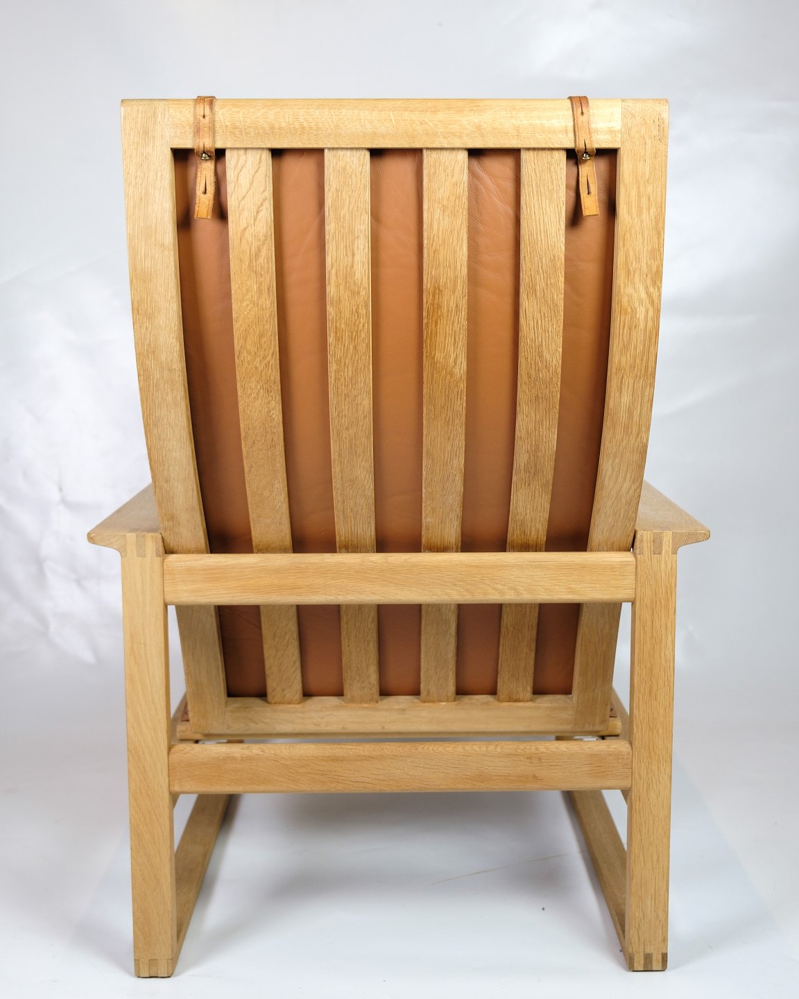 SolgtSlædestolen, model BM2254, designet af Børge Mogensen og fremstillet af Fredericia Stolefabrik. Stolen er udført i lys eg med sæde og ryglæn polstret i cognacfarvet Elegance læder, som giver et varmt og klassisk udtryk. Det karakteristiske slædeformede stel understreger både stabilitet og lethed i designet, samtidig med at det sikrer god komfort.