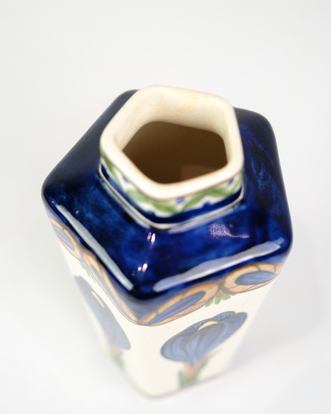 This elegant vase, model 1044/102, is made of earthenware and has a beautiful square shape. It is decorated with a delicate, hand-painted tulip motif, which gives a classic and timeless expression. Perfect as a decorative object or for flower arrangements.