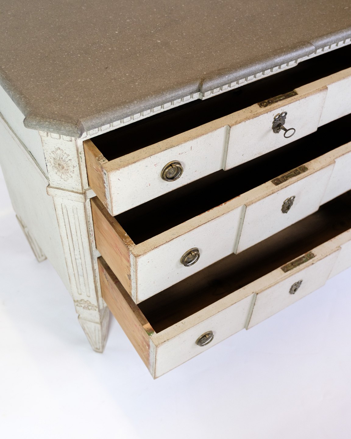 Gustavian chest of drawers from the 1840s with three drawers, painted grey in a classic style. Top made of marbled wood, giving an elegant expression. Swedish origin with period carvings and details. An authentic piece of furniture with both function and decorative value.