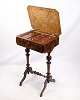 Antique sewing/side table in hand-polished mahogany from the 1890s. With built-in storage and turned legs.