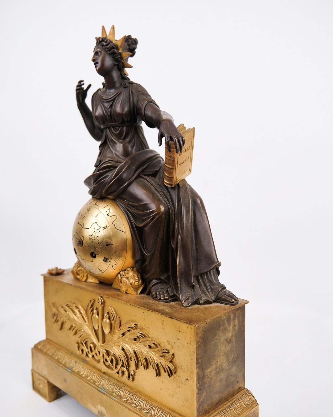 French Mantel Clock - Bronze - Decorated With Female Figure with Radiant Crown and Book - Paris - Year 1820s