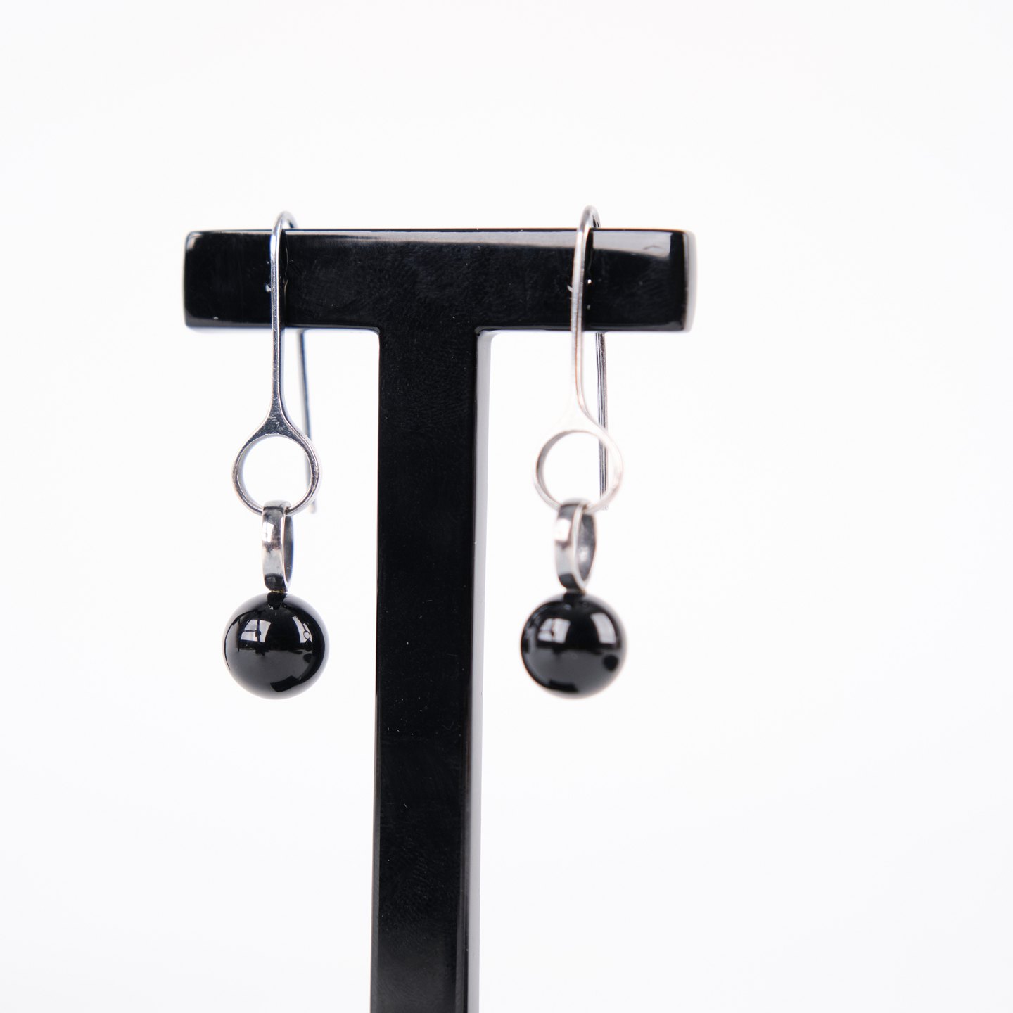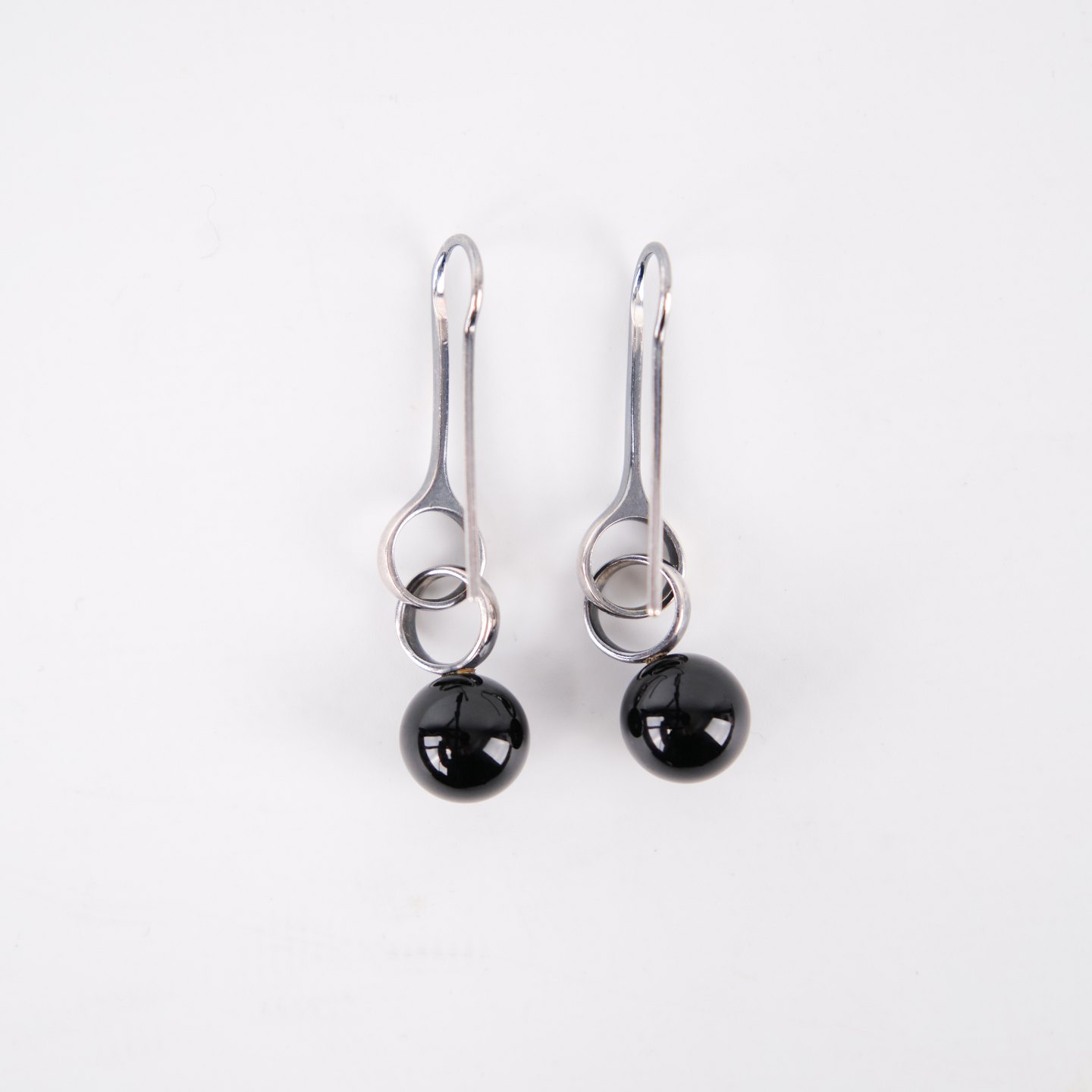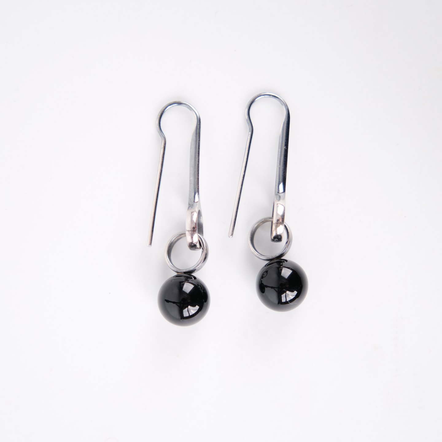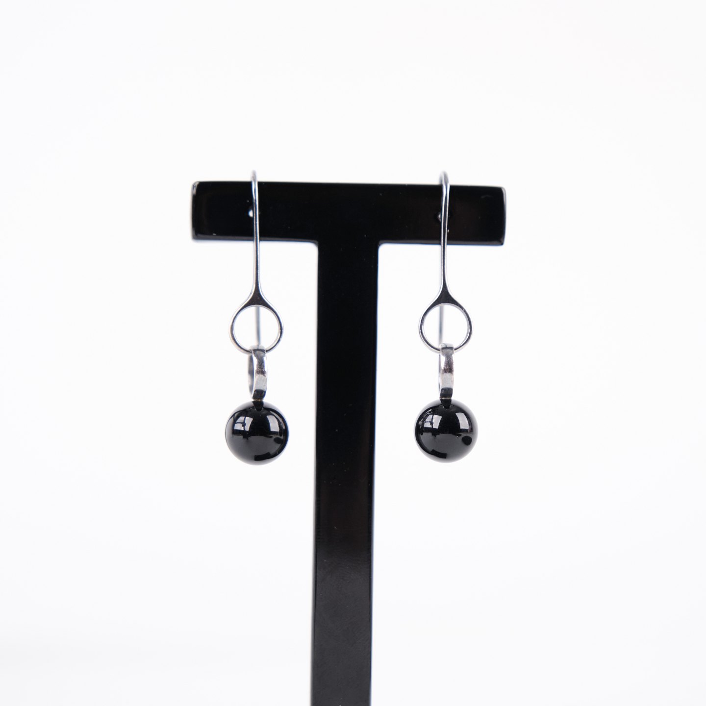 Earrings in sterling silver, stamped GJ 925S, designed by Regitze Overgaard for Georg Jensen. Elegant sphere earrings featuring black agate, model 473A. A refined piece of jewellery combining clean lines with quality materials.
