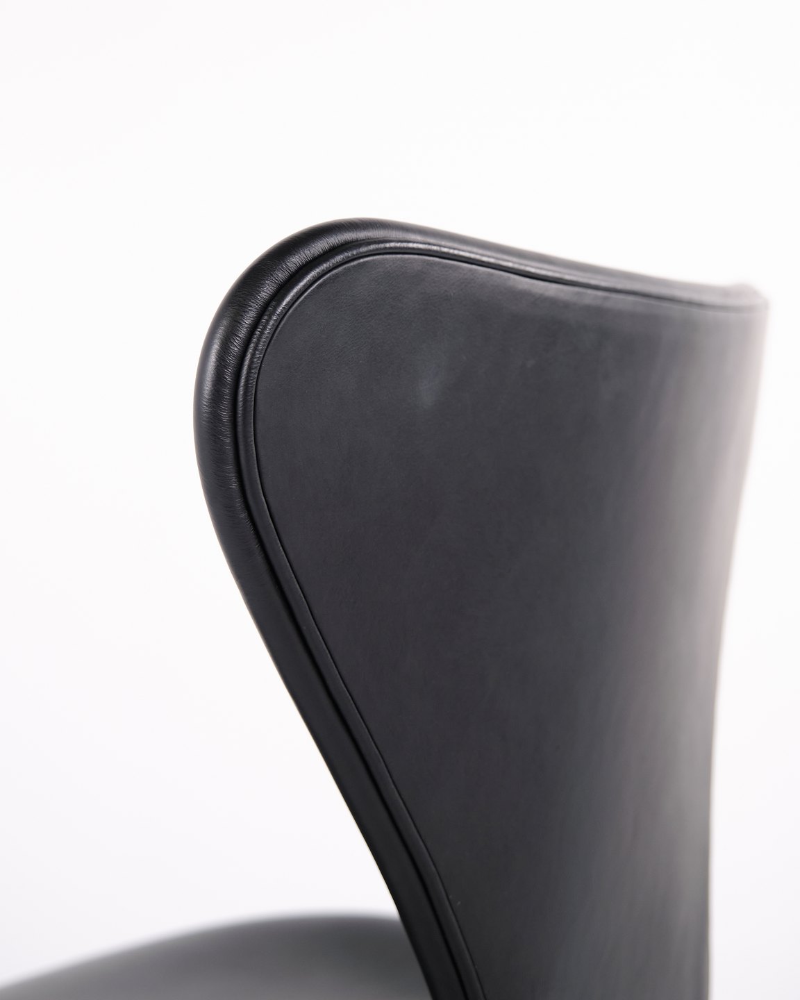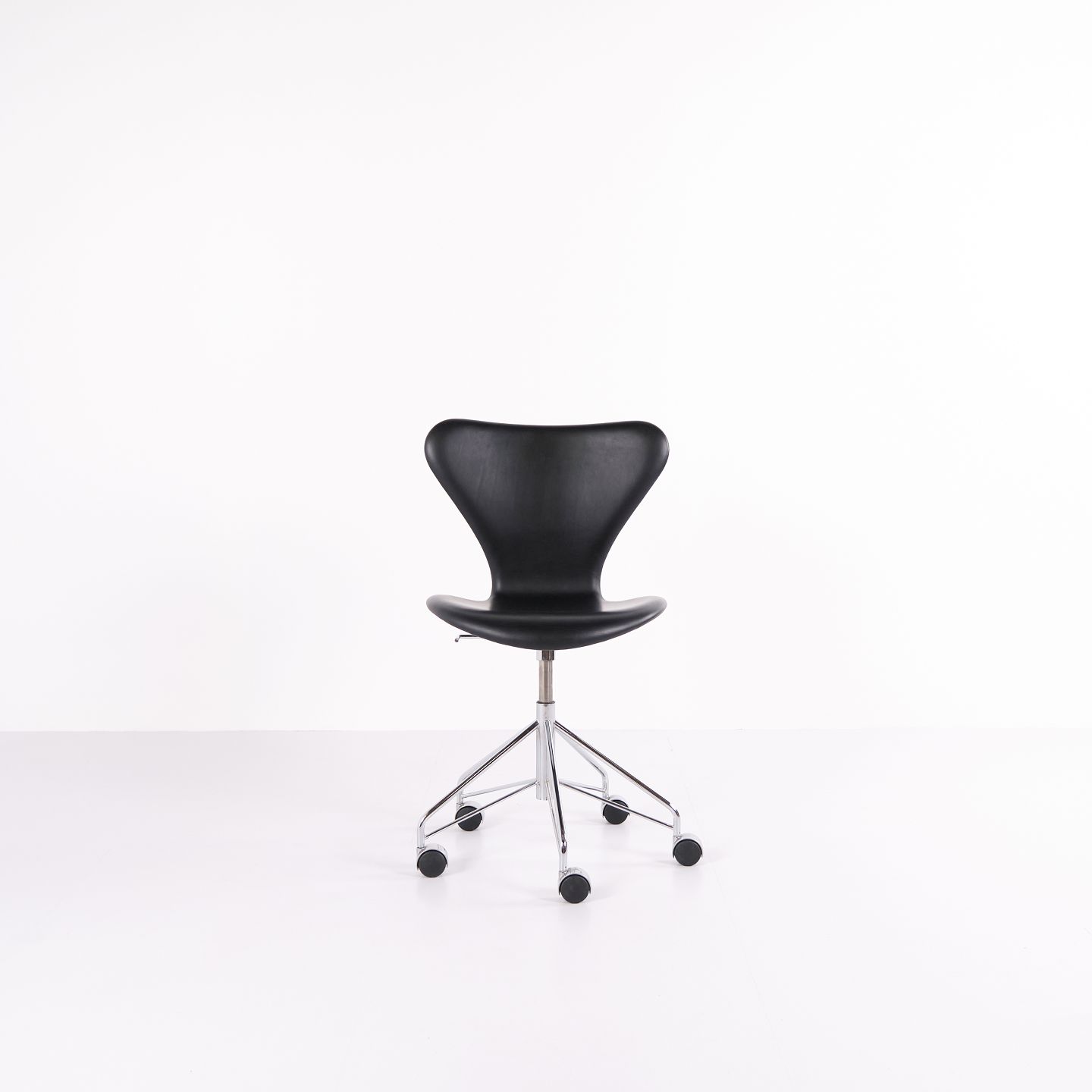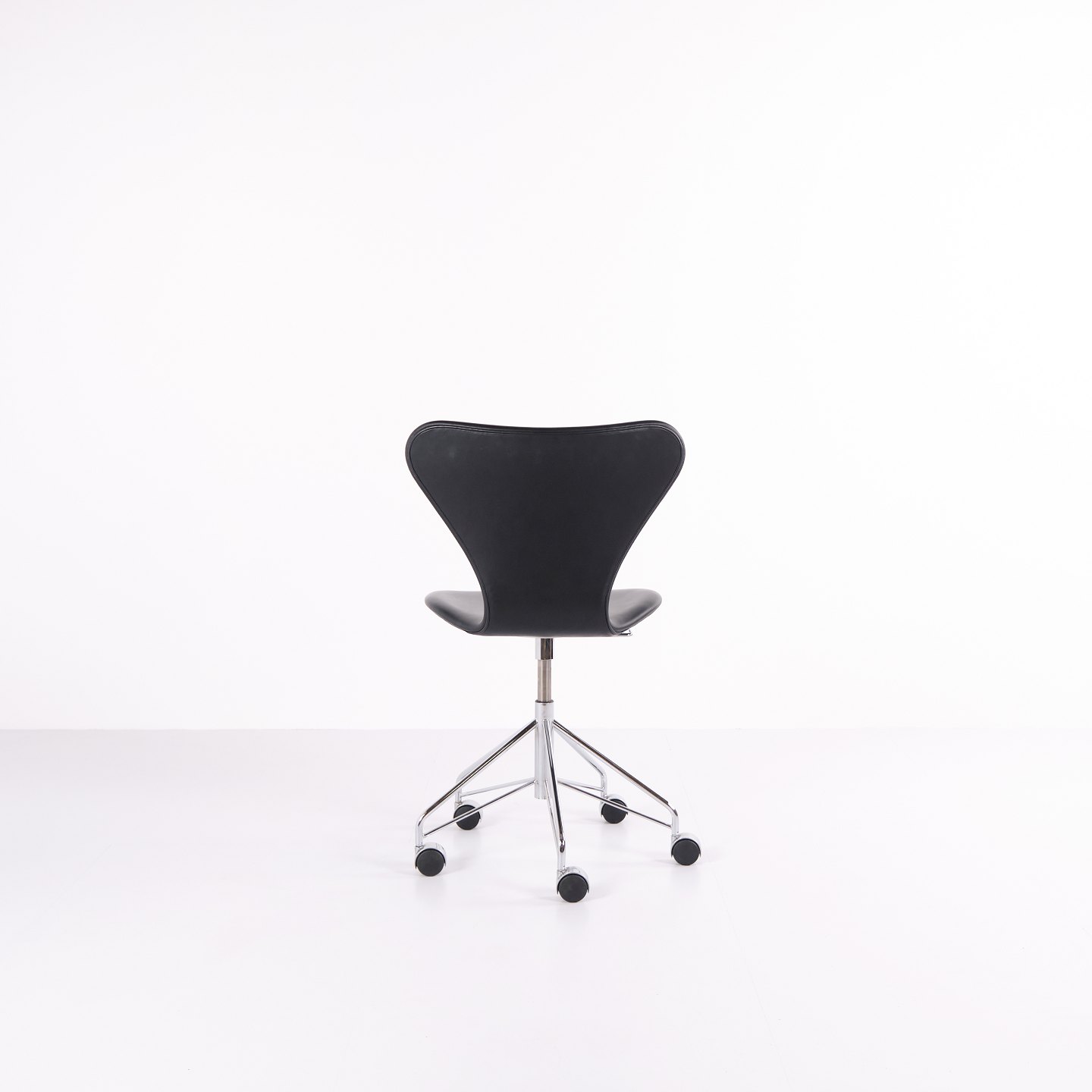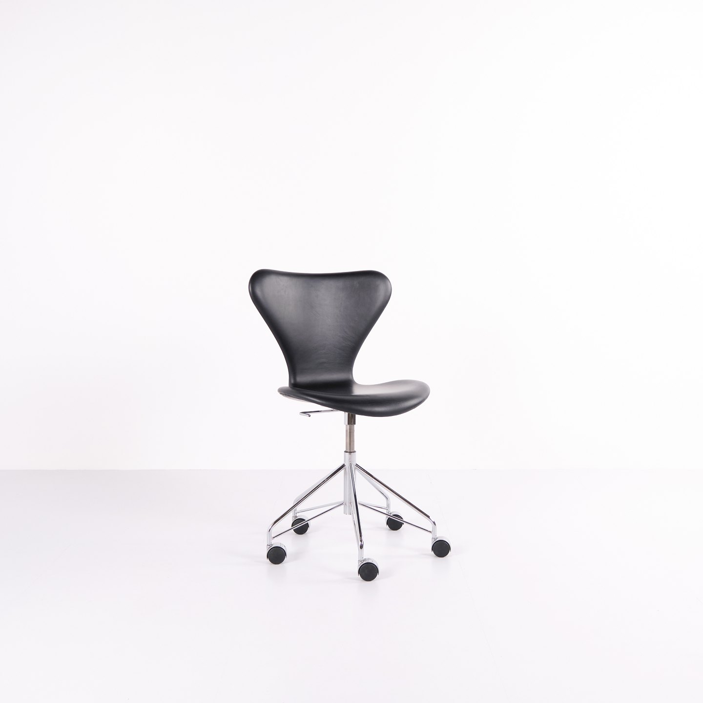 Arne Jacobsen Syver office chair, model 3117, for Fritz Hansen. In black leather and chrome frame with wheels. Classic Danish design.