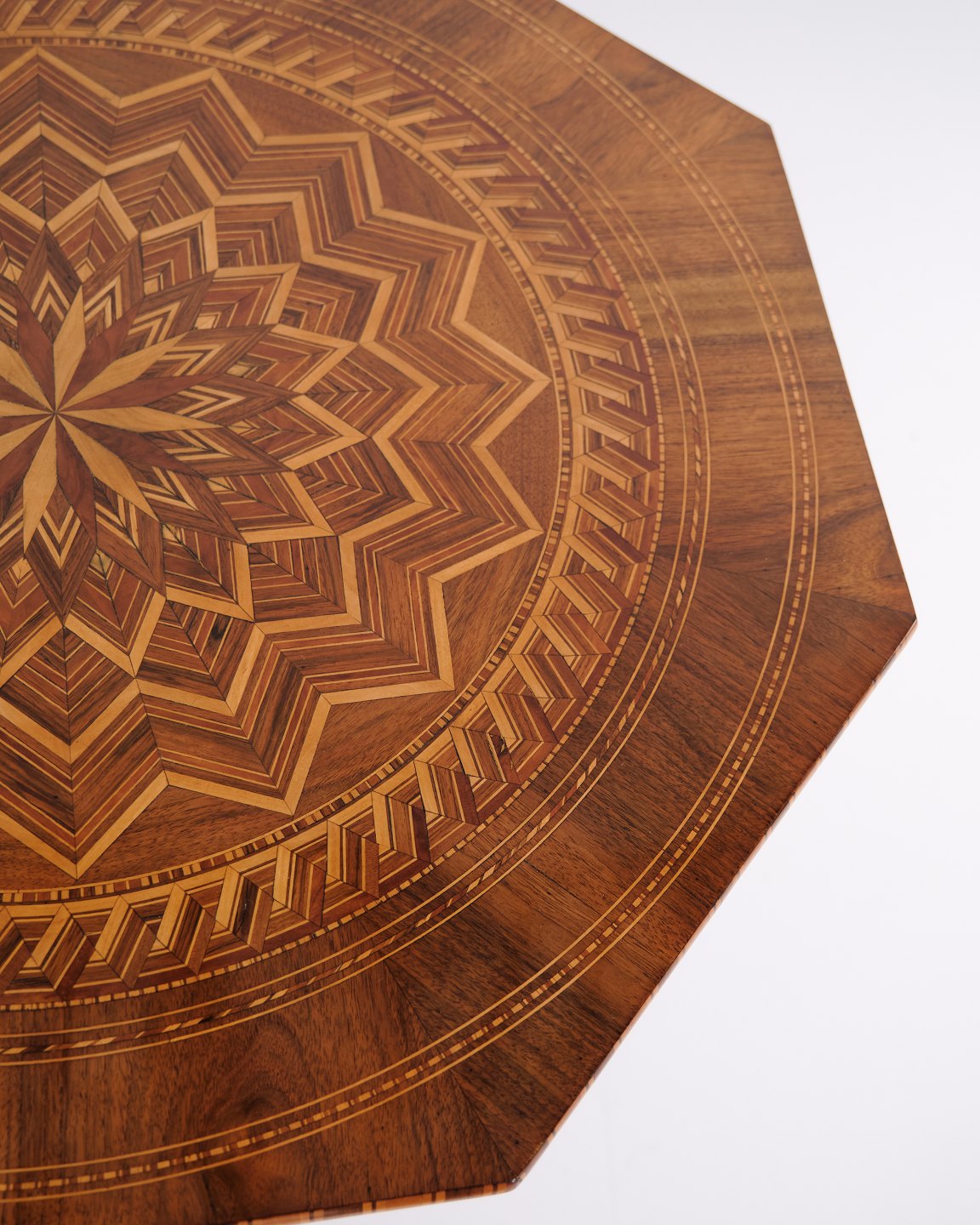 Octagonal column table from Italy, dated to the 1850s. The table is richly decorated with hand-laid intarsia, which emphasizes the geometric shapes and the overall decorative expression.