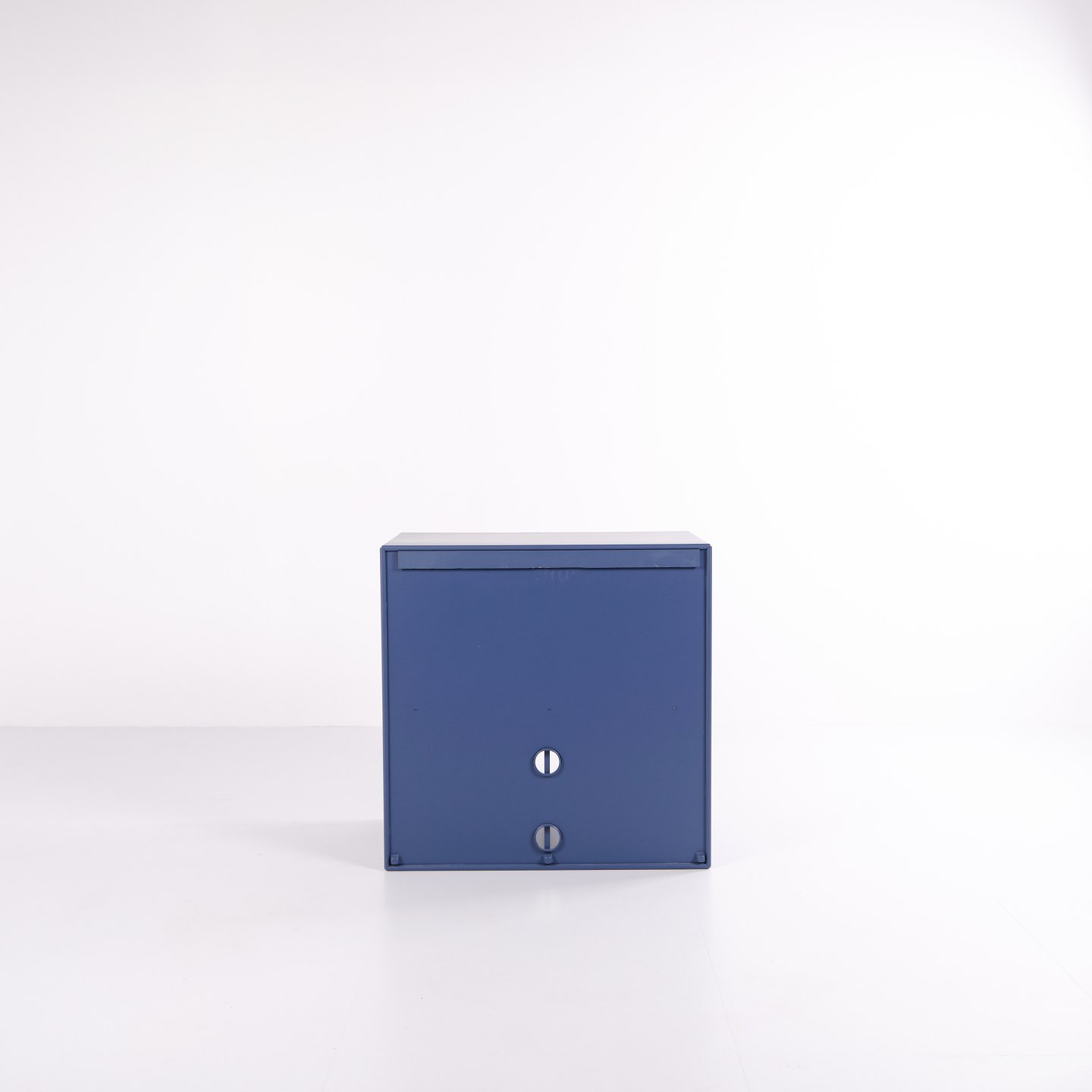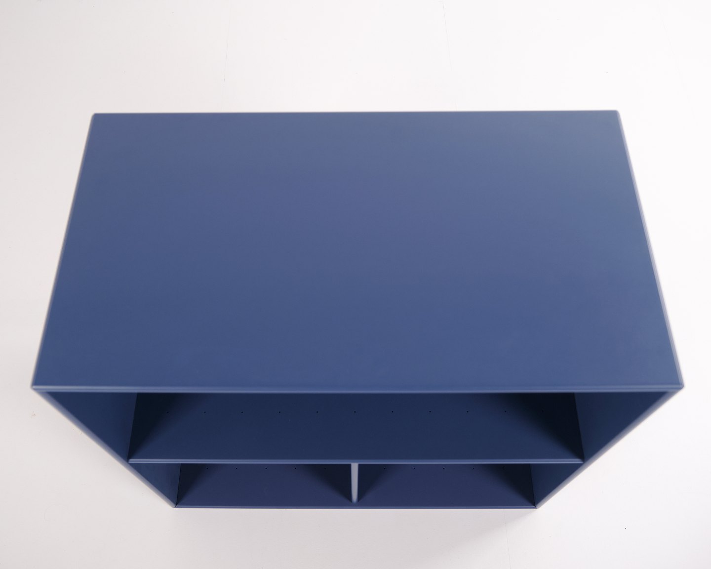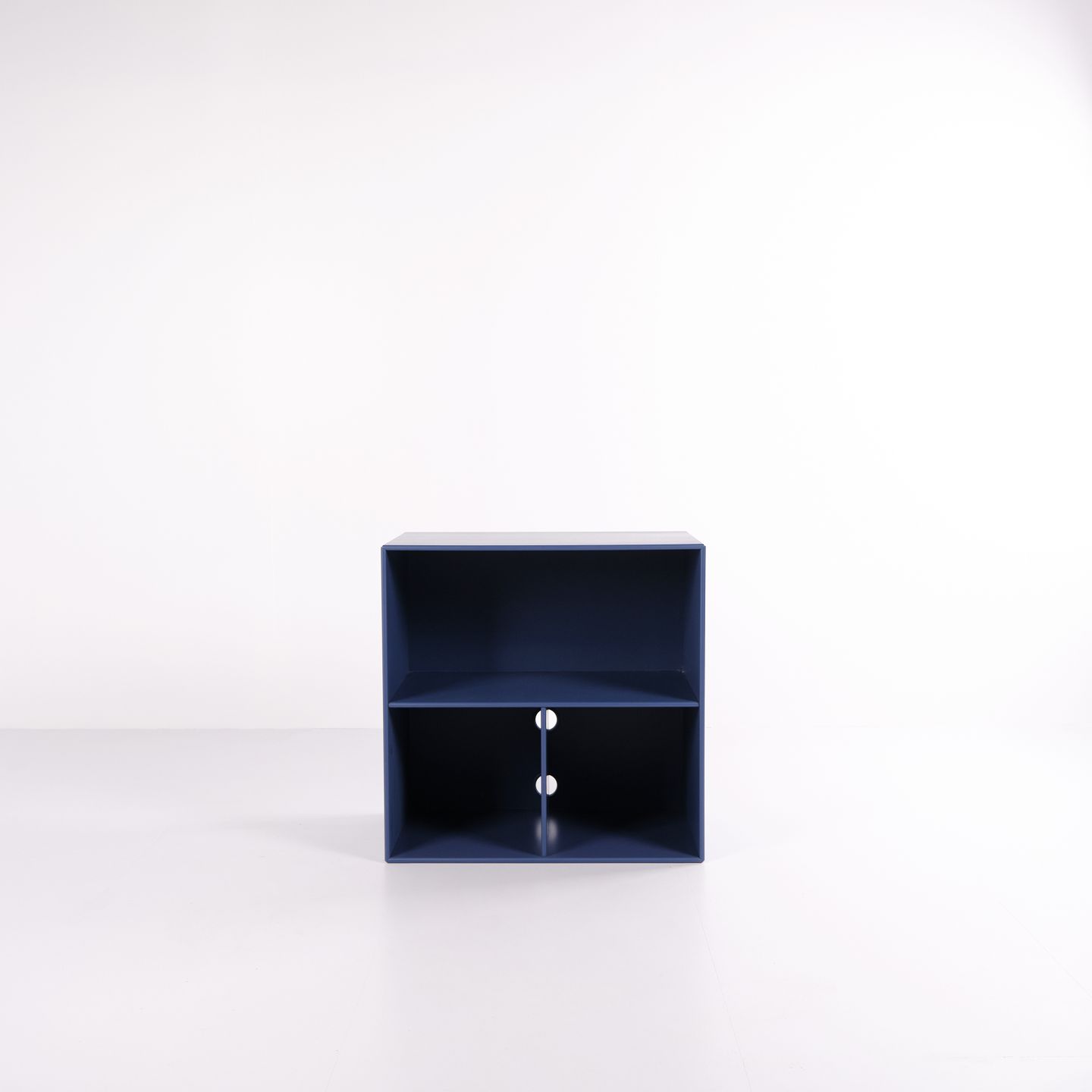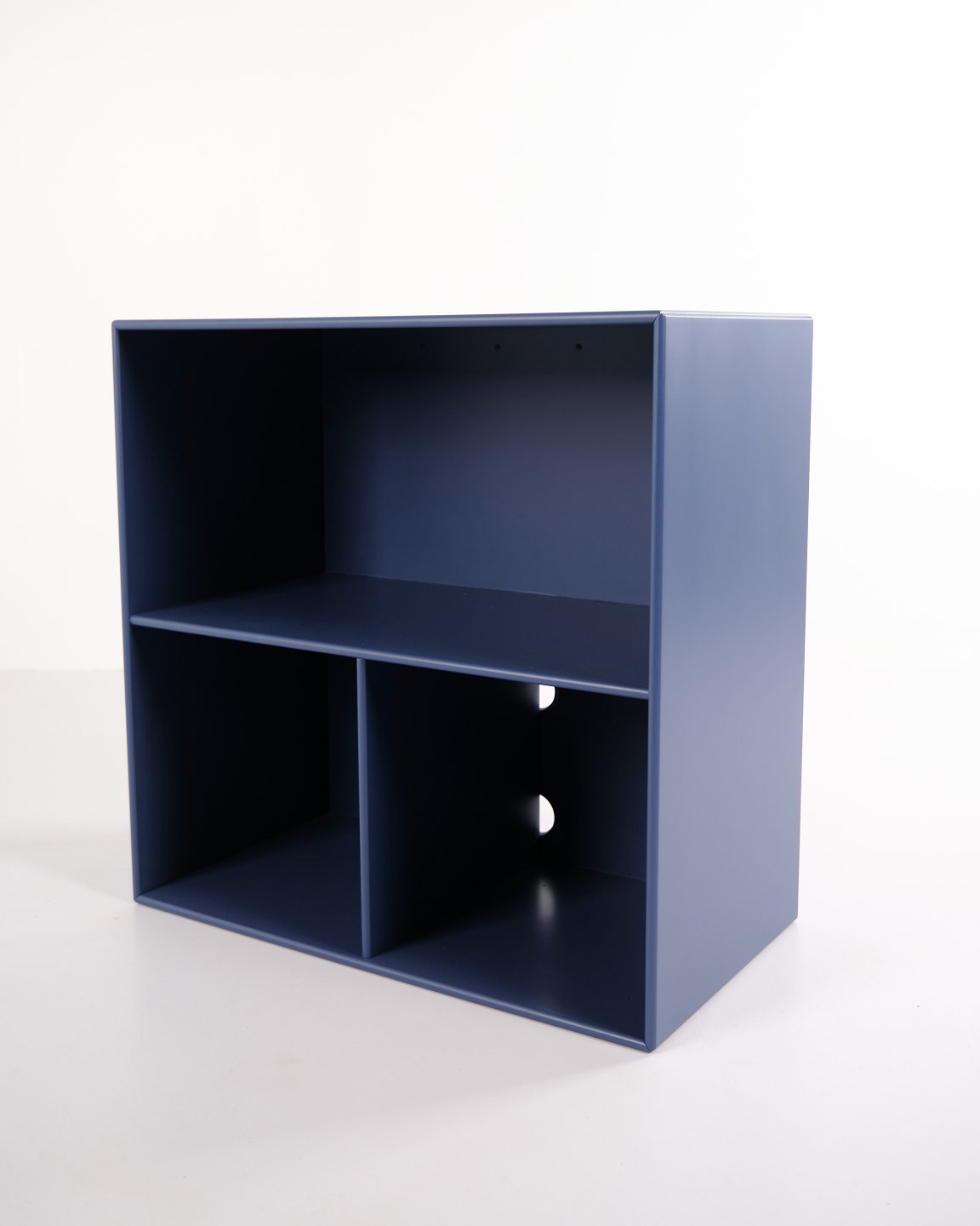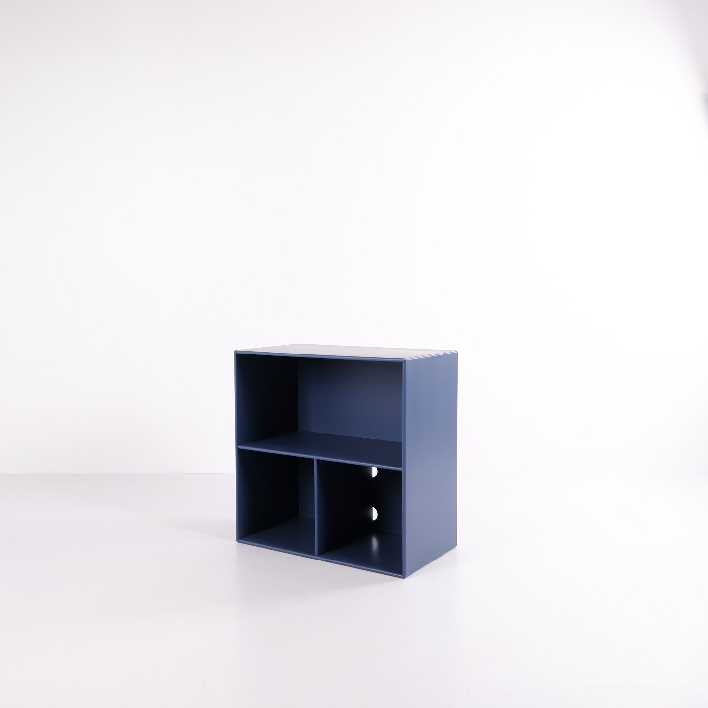 Montana shelf unit in blue with chrome legs. Features three open shelves, ideal for storage or display in a living room, office or hallway. A classic Montana module with simple structure and high functionality.